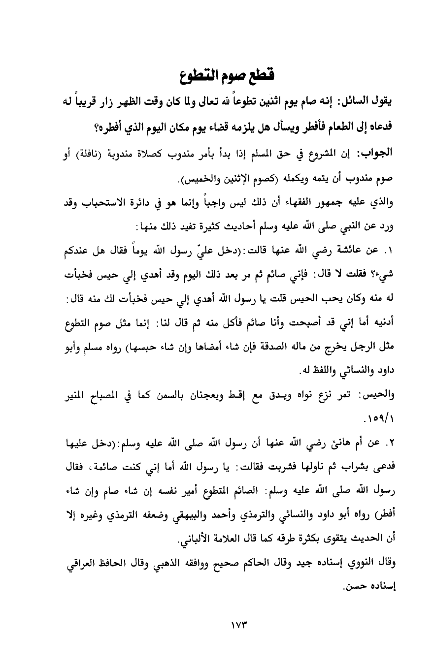 1. عن عائشة رضي الله عنها قالت: (دخل عليّ رسول الله يوماً فقال هل عندكم شيء؟ فقلت لا قال: فإني صائم ثم مر بعد ذلك اليوم وقد أهدي إلي حيس فخبأت له منه وكان يحب الحيس قلت يا رسول الله أهدي إلي حيس فخبأت لك منه قال: أدنيه أما إني قد أصبحت وأنا صائم فأكل منه ثم قال لنا: إنما مثل صوم التطوع مثل الرجل يخرج من ماله الصدقة فإن شاء أمضاها وإن شاء حبسها) رواه مسلم وأبو داود والنسائي واللفظ له.