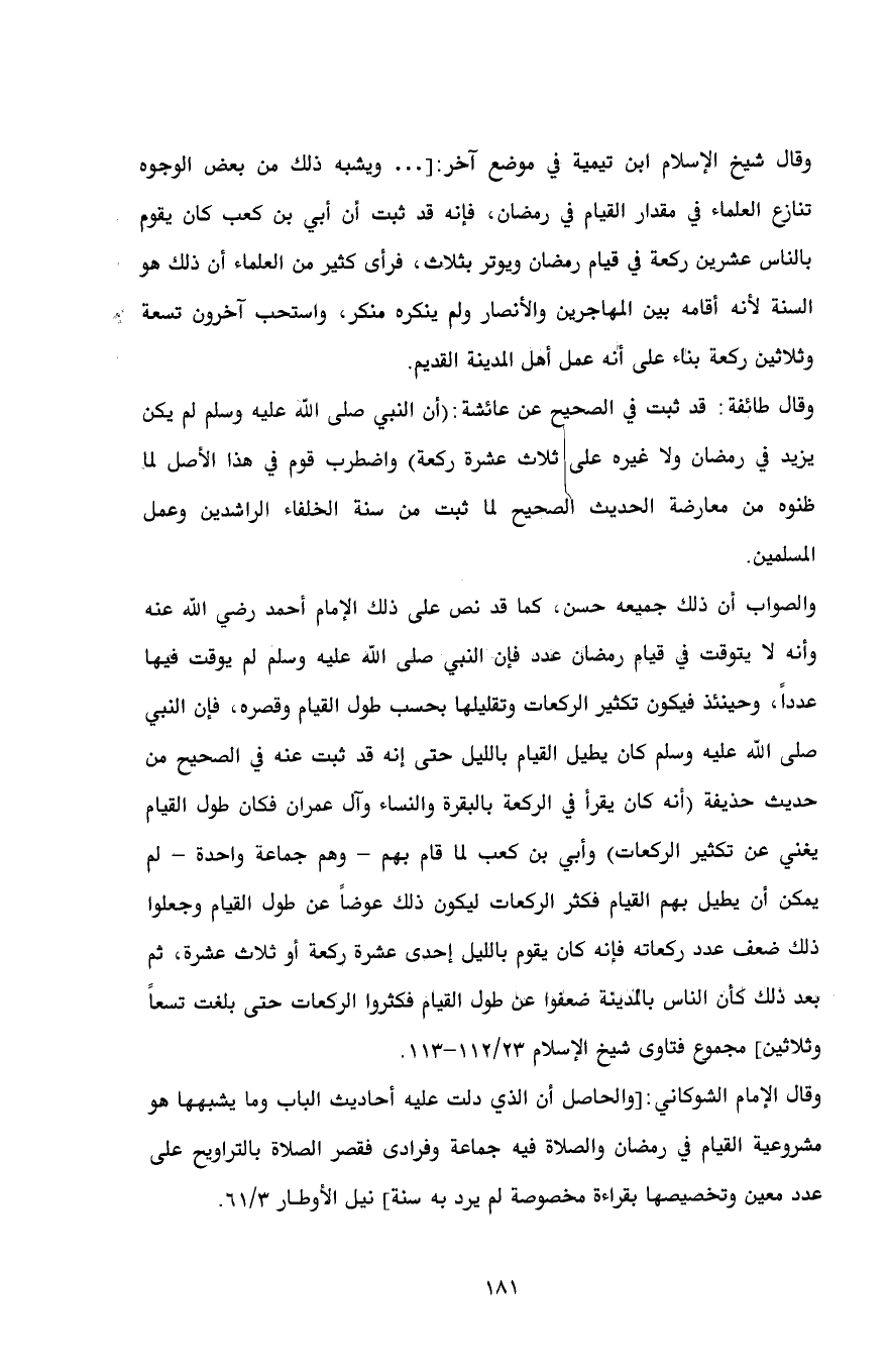 وقال الإمام الشوكاني: [والحاصل أن الذي دلت عليه أحاديث الباب وما يشبهها هو مشروعية القيام في رمضان والصلاة فيه جماعة وفرادى فقصر الصلاة بالتراويح على عدد معين وتخصيصها بقراءة مخصوصة لم يرد به سنة] نيل الأوطار 3/ 61.