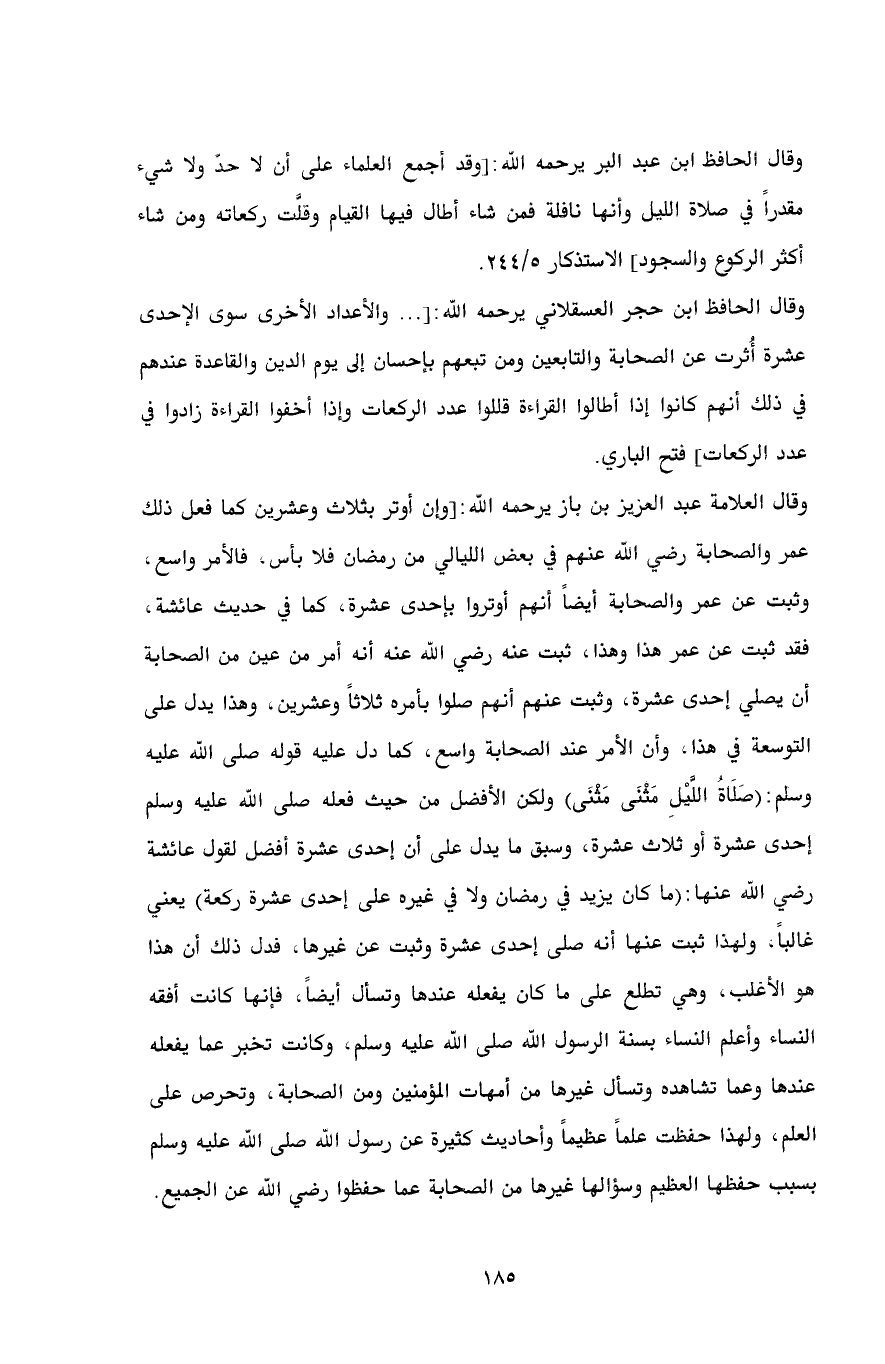وقال الحافظ ابن عبد البر يرحمه الله: [وقد أجمع العلماء على أن لا حدّ ولا شيء مقدراً في صلاة الليل وأنها نافلة فمن شاء أطال فيها القيام وقلَّت ركعاته ومن شاء أكثر الركوع والسجود] الاستذكار 5/ 244.