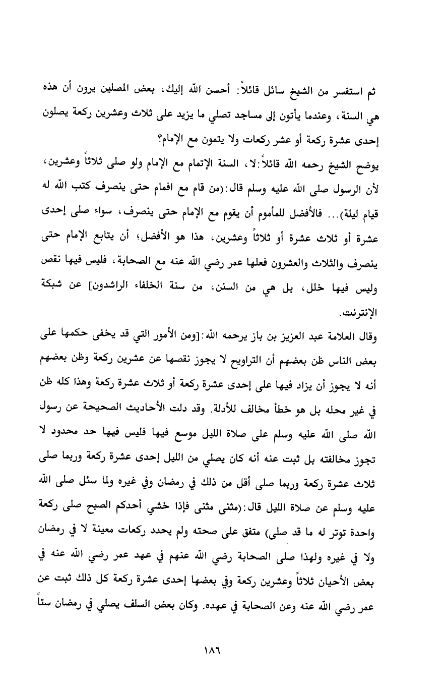 ثم استفسر من الشيخ سائل قائلاً: أحسن الله إليك، بعض المصلين يرون أن هذه هي السنة، وعندما يأتون إلى مساجد تصلي ما يزيد على ثلاث وعشرين ركعة يصلون إحدى عشرة ركعة أو عشر ركعات ولا يتمون مع الإمام؟