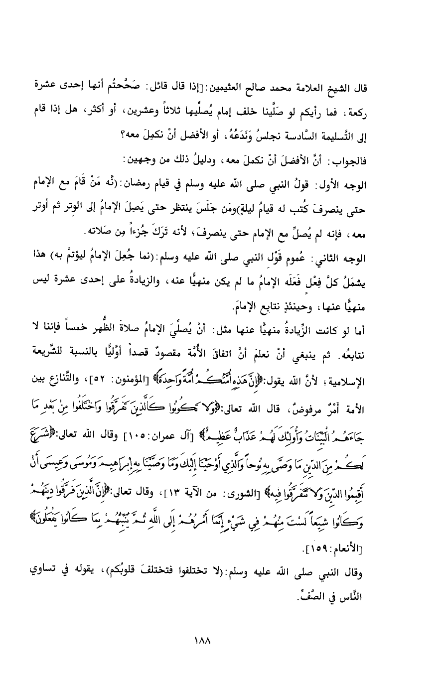 أما لو كانت الزِّيادةُ منهيًّا عنها مثل: أنْ يُصلِّيَ الإمامُ صلاةَ الظُّهر خمساً فإننا لا نتابعُه. ثم ينبغي أنْ نعلمَ أنَّ اتفاقَ الأُمَّة مقصودٌ قصداً أوَّليًّا بالنسبة للشَّريعة الإسلامية؛ لأنَّ الله يقول: {إِنَّ هَذِهِ أُمَّتُكُمْ أُمَّةً وَاحِدَةً} [المؤمنون: 52]، والتَّنازع بين الأمة أَمْرٌ مرفوضٌ، قال الله تعالى: {وَلا تَكُونُوا كَالَّذِينَ تَفَرَّقُوا وَاخْتَلَفُوا مِنْ بَعْدِ مَا جَاءَهُمُ الْبَيِّنَاتُ وَأُولَئِكَ لَهُمْ عَذَابٌ عَظِيمٌ} [آل عمران:105] وقال الله تعالى: {شَرَعَ لَكُمْ مِنَ الدِّينِ مَا وَصَّى بِهِ نُوحاً وَالَّذِي أَوْحَيْنَا إِلَيْكَ وَمَا وَصَّيْنَا بِهِ إِبْرَاهِيمَ وَمُوسَى وَعِيسَى أَنْ أَقِيمُوا الدِّينَ وَلا تَتَفَرَّقُوا فِيه} [الشورى: من الآية 13]، وقال تعالى: {إِنَّ الَّذِينَ فَرَّقُوا دِينَهُمْ وَكَانُوا شِيَعاً لَسْتَ مِنْهُمْ فِي شَيْءٍ إِنَّمَا أَمْرُهُمْ إِلَى اللَّهِ ثُمَّ يُنَبِّئُهُمْ بِمَا كَانُوا يَفْعَلُونَ} [الأنعام:159].