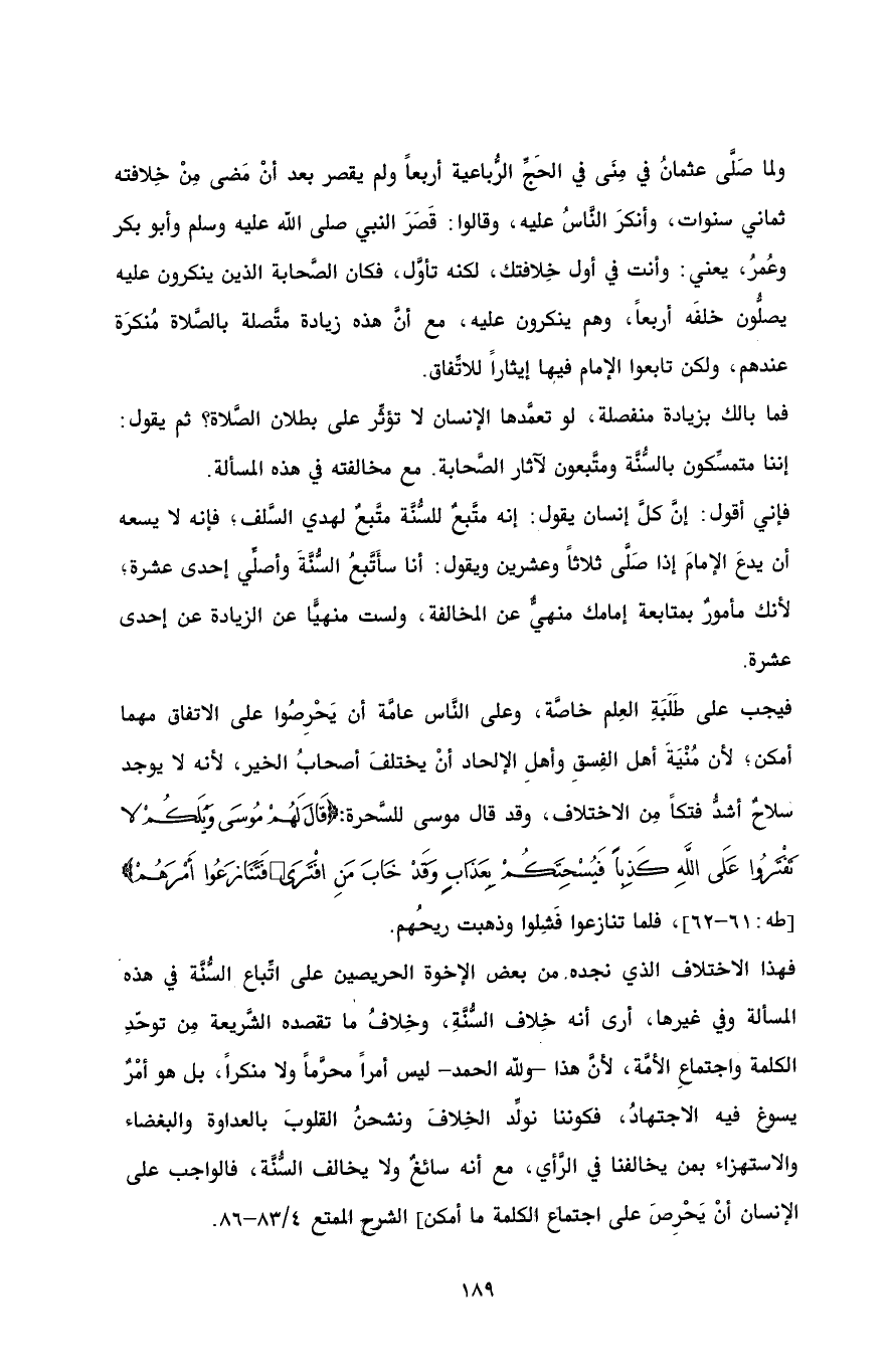 ولما صَلَّى عثمانُ في مِنَى في الحَجِّ الرُّباعية أربعاً ولم يقصر بعد أنْ مَضى مِنْ خِلافته ثماني سنوات، وأنكرَ النَّاسُ عليه، وقالوا: قَصَرَ النبي صلى الله عليه وسلم وأبو بكر وعُمرُ، يعني: وأنت في أول خِلافتك، لكنه تأوَّل، فكان الصَّحابة الذين ينكرون عليه يصلُّون خلفَه أربعاً، وهم ينكرون عليه، مع أنَّ هذه زيادة متَّصلة بالصَّلاة مُنكرَة عندهم، ولكن تابعوا الإمام فيها إيثاراً للاتِّفاق.