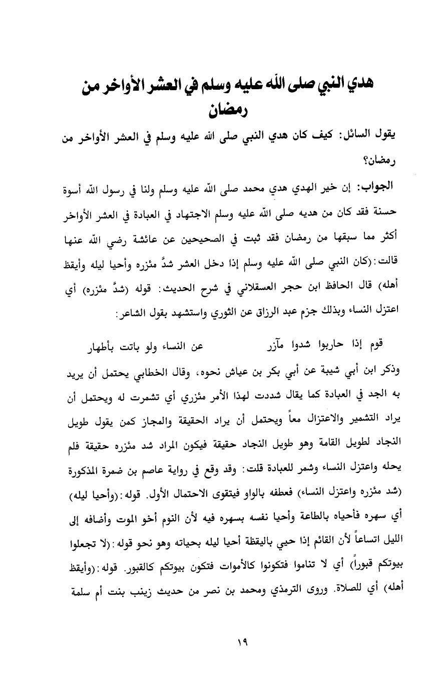 الجواب: إن خير الهدي هدي محمد صلى الله عليه وسلم ولنا في رسول الله أسوة حسنة فقد كان من هديه صلى الله عليه وسلم الاجتهاد في العبادة في العشر الأواخر أكثر مما سبقها من رمضان فقد ثبت في الصحيحين عن عائشة رضي الله عنها قالت: (كان النبي صلى الله عليه وسلم إذا دخل العشر شدَّ مئزره وأحيا ليله وأيقظ أهله) قال الحافظ ابن حجر العسقلاني في شرح الحديث: قوله (شدَّ مئزره) أي اعتزل النساء وبذلك جزم عبد الرزاق عن الثوري واستشهد بقول الشاعر: