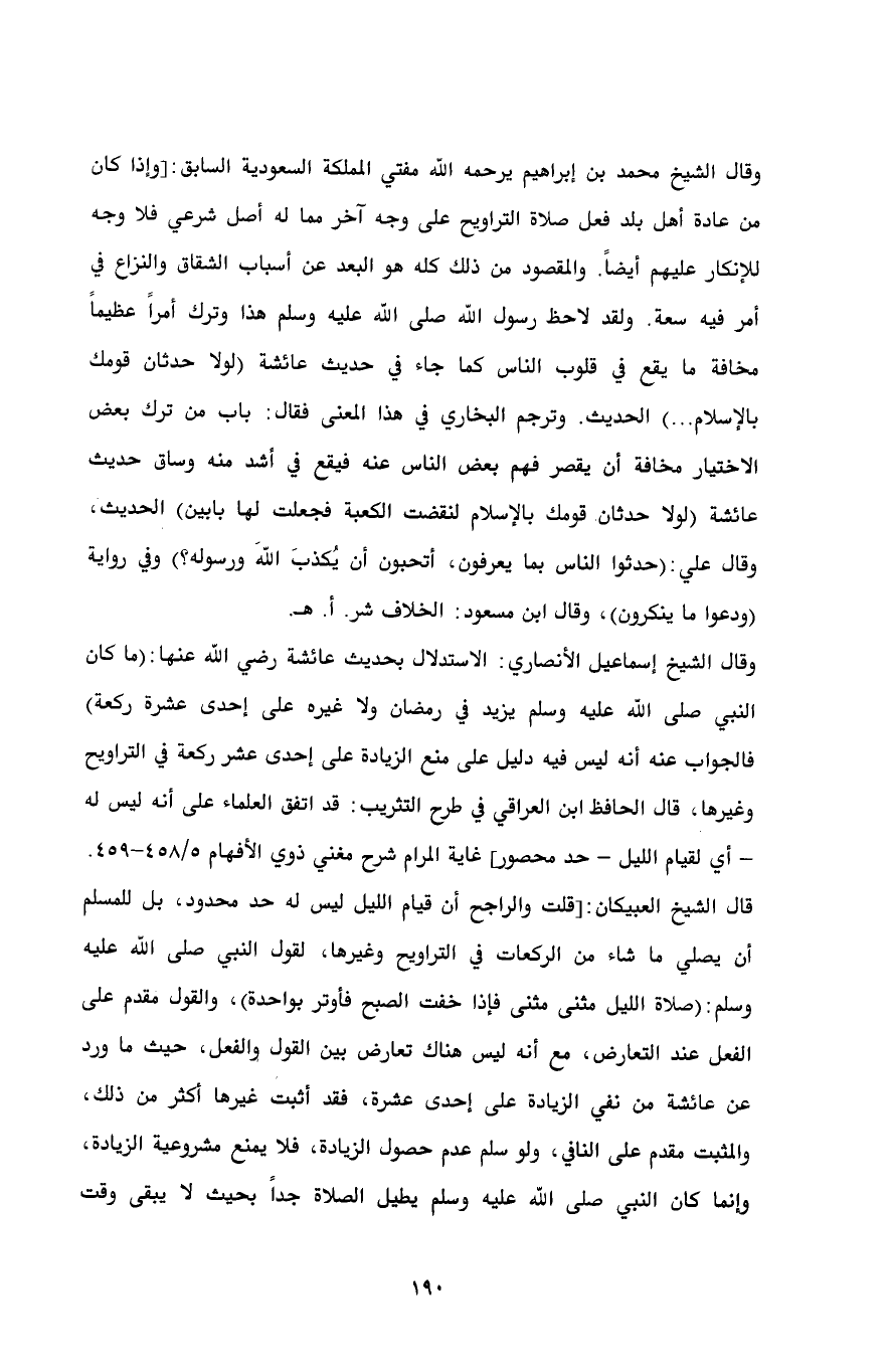 وقال الشيخ محمد بن إبراهيم يرحمه الله مفتي المملكة السعودية السابق: [وإذا كان من عادة أهل بلد فعل صلاة التراويح على وجه آخر مما له أصل شرعي فلا وجه للإنكار عليهم أيضاً. والمقصود من ذلك كله هو البعد عن أسباب الشقاق والنزاع في أمر فيه سعة. ولقد لاحظ رسول الله صلى الله عليه وسلم هذا وترك أمراً عظيماً مخافة ما يقع في قلوب الناس كما جاء في حديث عائشة (لولا حدثان قومك بالإسلام ... ) الحديث. وترجم البخاري في هذا المعنى فقال: باب من ترك بعض الاختيار مخافة أن يقصر فهم بعض الناس عنه فيقع في أشد منه وساق حديث عائشة (لولا حدثان قومك بالإسلام لنقضت الكعبة فجعلت لها بابين) الحديث، وقال علي: (حدثوا الناس بما يعرفون، أتحبون أن يُكذبَ اللهَ ورسوله؟) وفي رواية (ودعوا ما ينكرون)، وقال ابن مسعود: الخلاف شر. أ. هـ.