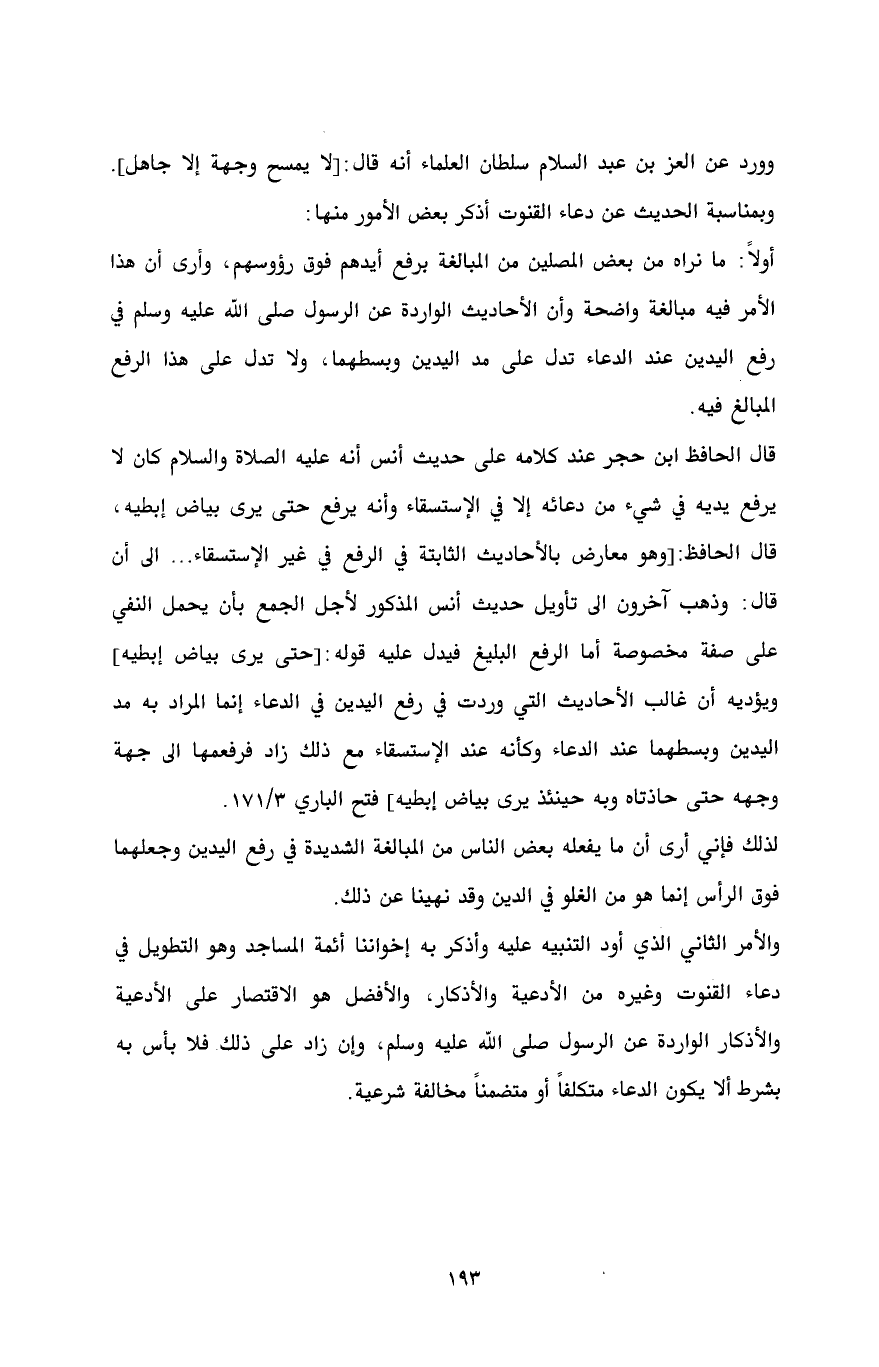 وورد عن العز بن عبد السلام سلطان العلماء أنه قال: [لا يمسح وجهة إلا جاهل]. وبمناسبة الحديث عن دعاء القنوت أذكر بعض الأمور منها: