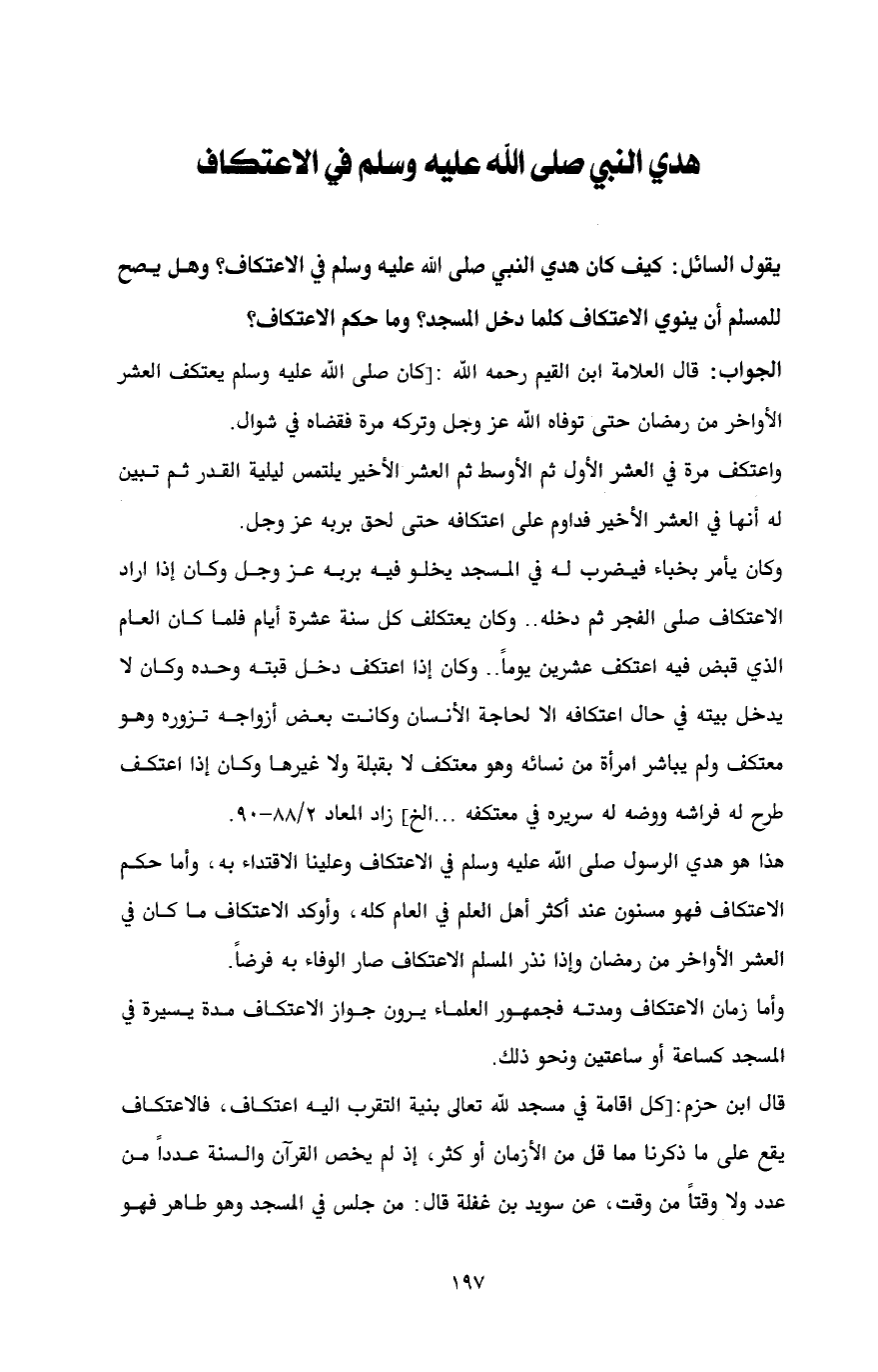 وكان يأمر بخباء فيضرب له في المسجد يخلو فيه بربه عز وجل وكان إذا اراد الاعتكاف صلى الفجر ثم دخله .. وكان يعتكلف كل سنة عشرة أيام فلما كان العام الذي قبض فيه اعتكف عشرين يوماً .. وكان إذا اعتكف دخل قبته وحده وكان لا يدخل بيته في حال اعتكافه الا لحاجة الأنسان وكانت بعض أزواجه تزوره وهو معتكف ولم يباشر امرأة من نسائه وهو معتكف لا بقبلة ولا غيرها وكان إذا اعتكف طرح له فراشه ووضه له سريره في معتكفه ... الخ] زاد المعاد 2/ 88 - 90.