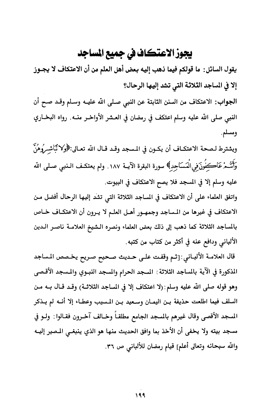 قال العلامة الألباني: [ثم وقفت على حديث صحيح صريح يخصص المساجد المذكورة في الآية بالمساجد الثلاثة: المسجد الحرام والمسجد النبوي والمسجد الأقصى وهو قوله صلى الله عليه وسلم: (لا اعتكاف إلا في المساجد الثلاثة) وقد قال به من السلف فيما اطلعت حذيفة بن اليمان وسعيد بن المسيب وعطاء إلا أنه لم يذكر المسجد الأقصى وقال غيرهم بالمسجد الجامع مطلقاً وخالف آخرون فقالوا: ولو في مسجد بيته ولا يخفى أن الأخذ بما وافق الحديث منها هو الذي ينبغي المصير إليه والله سبحانه وتعالى أعلم] قيام رمضان للألباني ص 36.