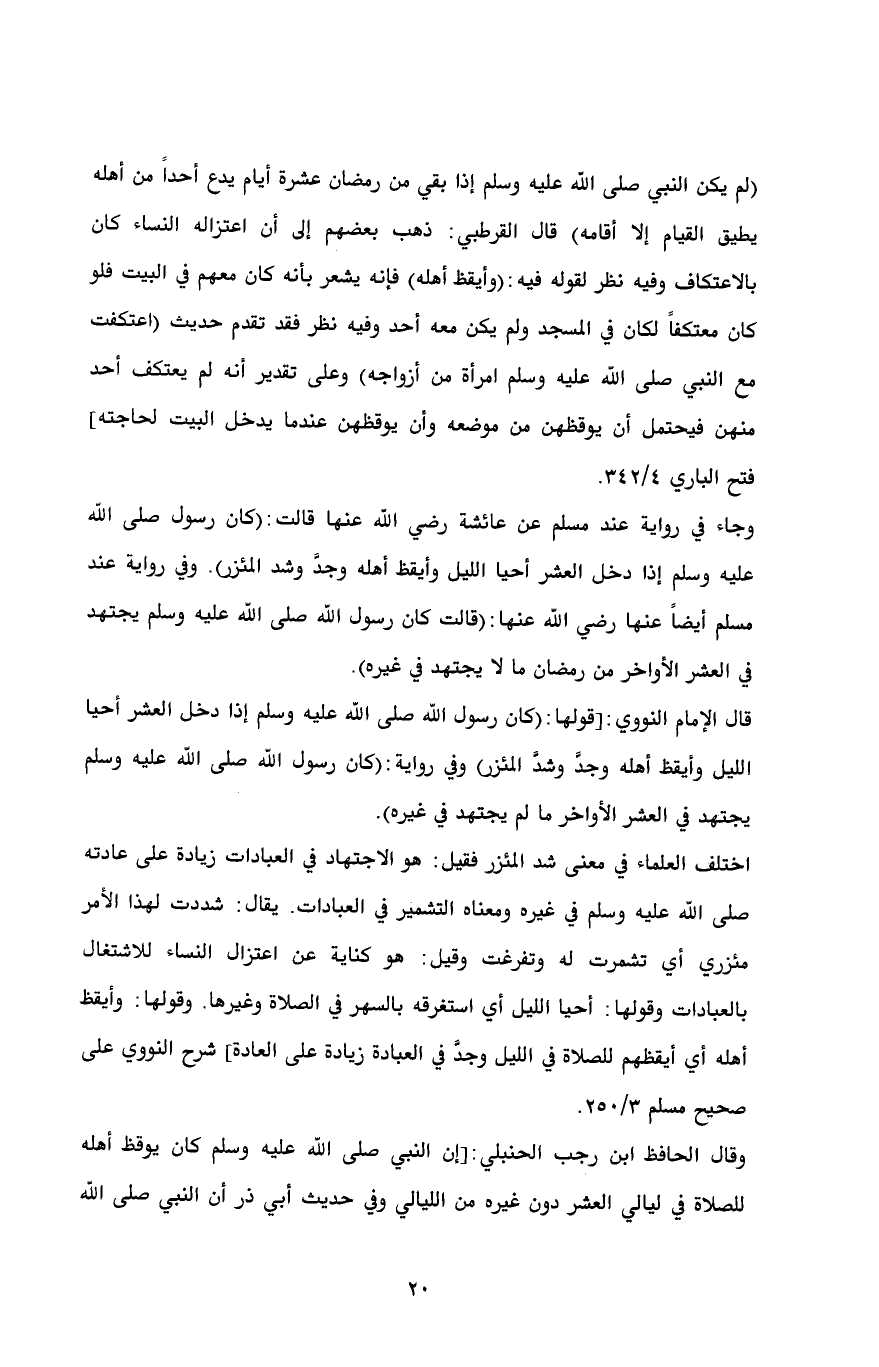 وجاء في رواية عند مسلم عن عائشة رضي الله عنها قالت: (كان رسول صلى الله عليه وسلم إذا دخل العشر أحيا الليل وأيقظ أهله وجدَّ وشد المئزر). وفي رواية عند مسلم أيضاً عنها رضي الله عنها: (قالت كان رسول الله صلى الله عليه وسلم يجتهد في العشر الأواخر من رمضان ما لا يجتهد في غيره).