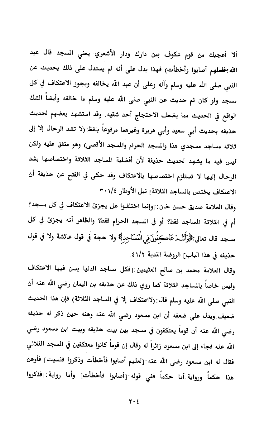 ألا أعجبك من قوم عكوف بين دارك ودار الأشعري يعني المسجد قال عبد الله: فلعلهم أصابوا وأخطأت) فهذا يدل على أنه لم يستدل على ذلك بحديث عن النبي صلى الله عليه وسلم وآله وعلى أن عبد الله يخالفه ويجوز الاعتكاف في كل مسجد ولو كان ثم حديث عن النبي صلى الله عليه وسلم ما خالفه وأيضاً الشك الواقع في الحديث مما يضعف الاحتجاج أحد شقيه. وقد استشهد بعضهم لحديث حذيفه بحديث أبي سعيد وأبي هريرة وغيرهما مرفوعاً بلفظ: (لا تشد الرحال إلا إلى ثلاثة مساجد مسجدي هذا والمسجد الحرام والمسجد الأقصى) وهو متفق عليه ولكن ليس فيه ما يشهد لحديث حذيفة لأن أفضلية المساجد الثلاثة واختصاصها بشد الرحال إليها لا تستلزم اختصاصها بالاعتكاف وقد حكى في الفتح عن حذيفة أن الاعتكاف يختص بالمساجد الثلاثة] نيل الأوطار 4/ 301