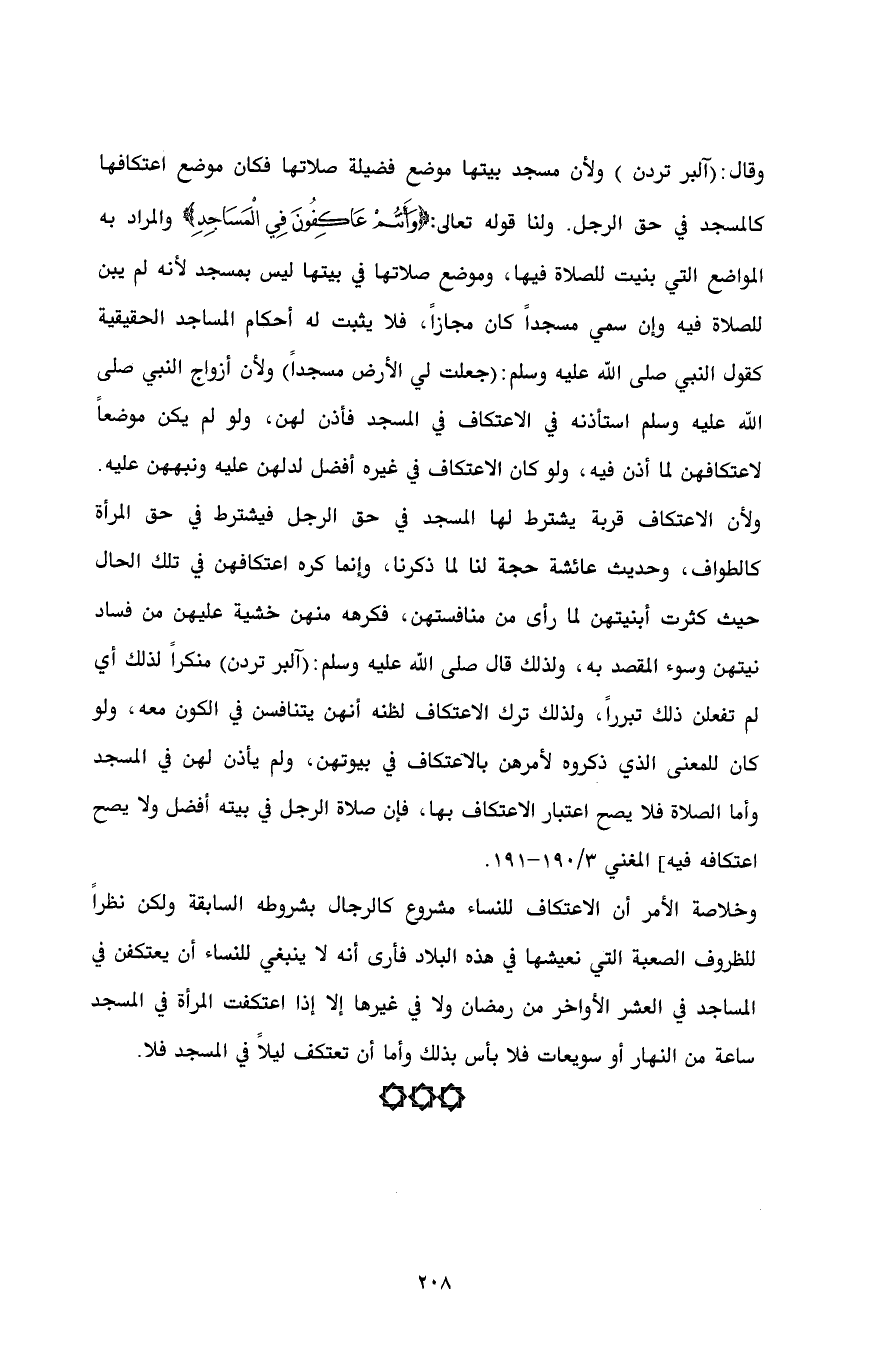 وقال: (آلبر تردن) ولأن مسجد بيتها موضع فضيلة صلاتها فكان موضع اعتكافها كالمسجد في حق الرجل. ولنا قوله تعالى: {وَأَنْتُمْ عَاكِفُونَ فِي الْمَسَاجِدِ} والمراد به المواضع التي بنيت للصلاة فيها، وموضع صلاتها في بيتها ليس بمسجد لأنه لم يبن للصلاة فيه وإن سمي مسجداً كان مجازاً، فلا يثبت له أحكام المساجد الحقيقية كقول النبي صلى الله عليه وسلم: (جعلت لي الأرض مسجداً) ولأن أزواج النبي صلى الله عليه وسلم استأذنه في الاعتكاف في المسجد فأذن لهن، ولو لم يكن موضعاً لاعتكافهن لما أذن فيه، ولو كان الاعتكاف في غيره أفضل لدلهن عليه ونبههن عليه. ولأن الاعتكاف قربة يشترط لها المسجد في حق الرجل فيشترط في حق المرأة كالطواف، وحديث عائشة حجة لنا لما ذكرنا، وإنما كره اعتكافهن في تلك الحال حيث كثرت أبنيتهن لما رأى من منافستهن، فكرهه منهن خشية عليهن من فساد نيتهن وسوء المقصد به، ولذلك قال صلى الله عليه وسلم: (آلبر تردن) منكراً لذلك أي لم تفعلن ذلك تبرراً، ولذلك ترك الاعتكاف لظنه أنهن يتنافسن في الكون معه، ولو كان للمعنى الذي ذكروه لأمرهن بالاعتكاف في بيوتهن، ولم يأذن لهن في المسجد وأما الصلاة فلا يصح اعتبار الاعتكاف بها، فإن صلاة الرجل في بيته أفضل ولا يصح اعتكافه فيه] المغني 3/ 190 - 191.