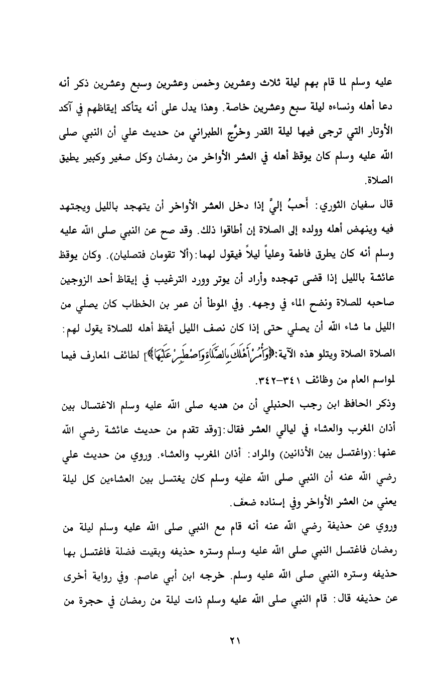 قال سفيان الثوري: أَحبُ إليَّ إذا دخل العشر الأواخر أن يتهجد بالليل ويجتهد فيه وينهض أهله وولده إلى الصلاة إن أطاقوا ذلك. وقد صح عن النبي صلى الله عليه وسلم أنه كان يطرق فاطمة وعلياً ليلاً فيقول لهما: (ألا تقومان فتصليان). وكان يوقظ عائشة بالليل إذا قضى تهجده وأراد أن يوتر وورد الترغيب في إيقاظ أحد الزوجين صاحبه للصلاة ونضح الماء في وجهه. وفي الموطأ أن عمر بن الخطاب كان يصلي من الليل ما شاء الله أن يصلي حتى إذا كان نصف الليل أيقظ أهله للصلاة يقول لهم: الصلاة الصلاة ويتلو هذه الآية: {وَأْمُرْ أَهْلَكَ بِالصَّلَاةِ وَاصْطَبِرْ عَلَيْهَا}] لطائف المعارف فيما لمواسم العام من وظائف 341 - 342.