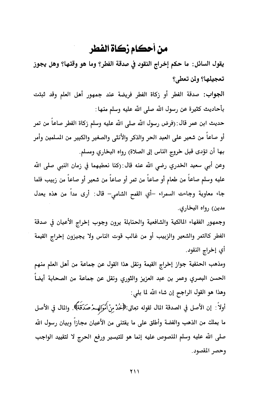 وجمهور الفقهاء المالكية والشافعية والحنابلة يرون وجوب إخراج الأعيان في صدقة الفطر كالتمر والشعير والزبيب أو من غالب قوت الناس ولا يجيزون إخراج القيمة أي إخراج النقود.