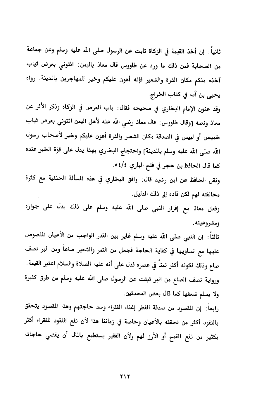 ثالثاً: إن النبي صلى الله عليه وسلم غاير بين القدر الواجب من الأعيان المنصوص عليها مع تساويها في كفاية الحاجة فجعل من التمر والشعير صاعاً ومن البر نصف صاع وذلك لكونه أكثر ثمناً في عصره فدل على أنه عليه الصلاة والسلام اعتبر القيمة.