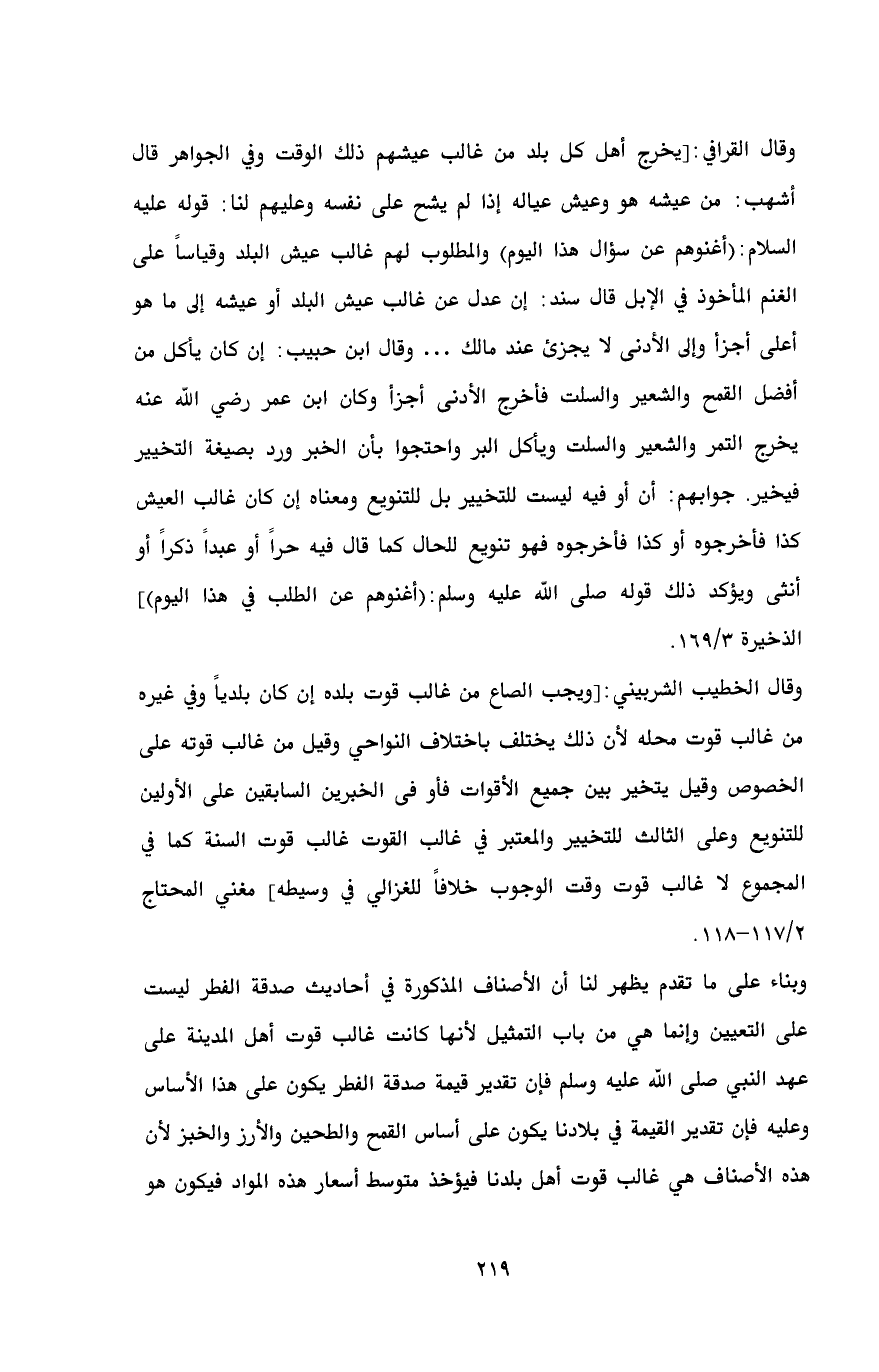 وقال القرافي: [يخرج أهل كل بلد من غالب عيشهم ذلك الوقت وفي الجواهر قال أشهب: من عيشه هو وعيش عياله إذا لم يشح على نفسه وعليهم لنا: قوله عليه السلام: (أغنوهم عن سؤال هذا اليوم) والمطلوب لهم غالب عيش البلد وقياساً على الغنم المأخوذ في الإبل قال سند: إن عدل عن غالب عيش البلد أو عيشه إلى ما هو أعلى أجزأ وإلى الأدنى لا يجزئ عند مالك ... وقال ابن حبيب: إن كان يأكل من أفضل القمح والشعير والسلت فأخرج الأدنى أجزأ وكان ابن عمر رضي الله عنه يخرج التمر والشعير والسلت ويأكل البر واحتجوا بأن الخبر ورد بصيغة التخيير فيخير. جوابهم: أن أو فيه ليست للتخيير بل للتنويع ومعناه إن كان غالب العيش كذا فأخرجوه أو كذا فأخرجوه فهو تنويع للحال كما قال فيه حراً أو عبداً ذكراً أو أنثى ويؤكد ذلك قوله صلى الله عليه وسلم: (أغنوهم عن الطلب في هذا اليوم)] الذخيرة 3/ 169.