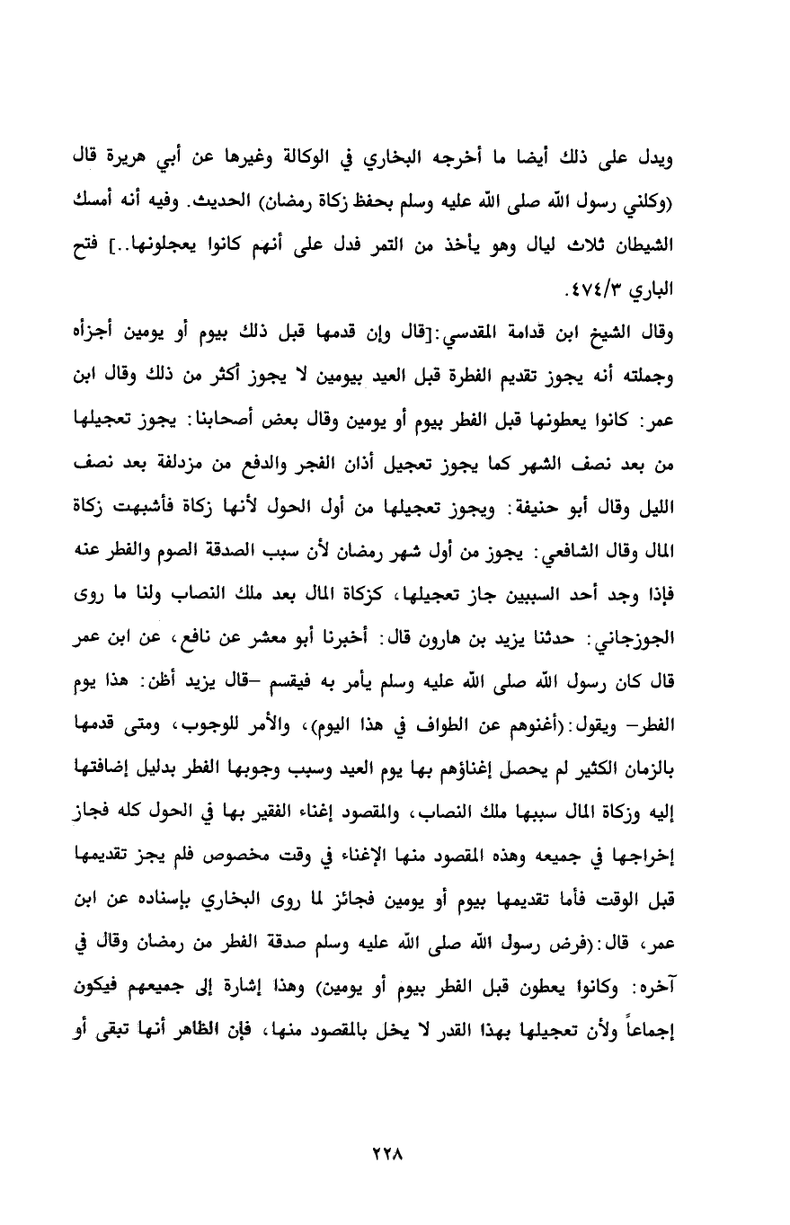 وقال الشيخ ابن قدامة المقدسي: [قال وإن قدمها قبل ذلك بيوم أو يومين أجزأه وجملته أنه يجوز تقديم الفطرة قبل العيد بيومين لا يجوز أكثر من ذلك وقال ابن عمر: كانوا يعطونها قبل الفطر بيوم أو يومين وقال بعض أصحابنا: يجوز تعجيلها من بعد نصف الشهر كما يجوز تعجيل أذان الفجر والدفع من مزدلفة بعد نصف الليل وقال أبو حنيفة: ويجوز تعجيلها من أول الحول لأنها زكاة فأشبهت زكاة المال وقال الشافعي: يجوز من أول شهر رمضان لأن سبب الصدقة الصوم والفطر عنه فإذا وجد أحد السببين جاز تعجيلها، كزكاة المال بعد ملك النصاب ولنا ما روى الجوزجاني: حدثنا يزيد بن هارون قال: أخبرنا أبو معشر عن نافع، عن ابن عمر قال كان رسول الله صلى الله عليه وسلم يأمر به فيقسم -قال يزيد أظن: هذا يوم الفطر- ويقول: (أغنوهم عن الطواف في هذا اليوم)، والأمر للوجوب، ومتى قدمها بالزمان الكثير لم يحصل إغناؤهم بها يوم العيد وسبب وجوبها الفطر بدليل إضافتها إليه وزكاة المال سببها ملك النصاب، والمقصود إغناء الفقير بها في الحول كله فجاز إخراجها في جميعه وهذه المقصود منها الإغناء في وقت مخصوص فلم يجز تقديمها قبل الوقت فأما تقديمها بيوم أو يومين فجائز لما روى البخاري بإسناده عن ابن عمر، قال: (فرض رسول الله صلى الله عليه وسلم صدقة الفطر من رمضان وقال في آخره: وكانوا يعطون قبل الفطر بيوم أو يومين) وهذا إشارة إلى جميعهم فيكون إجماعاً ولأن تعجيلها بهذا القدر لا يخل بالمقصود منها، فإن الظاهر أنها تبقى أو