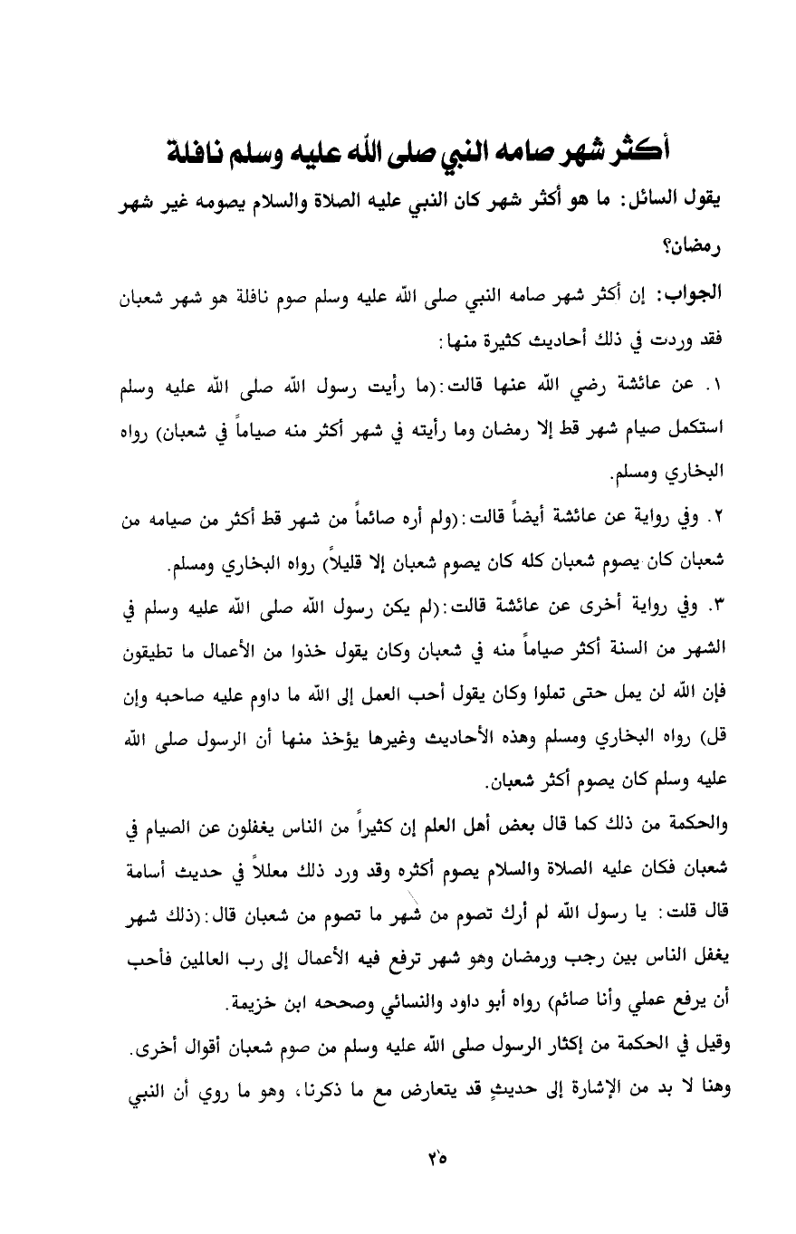 3. وفي رواية أخرى عن عائشة قالت: (لم يكن رسول الله صلى الله عليه وسلم في الشهر من السنة أكثر صياماً منه في شعبان وكان يقول خذوا من الأعمال ما تطيقون فإن الله لن يمل حتى تملوا وكان يقول أحب العمل إلى الله ما داوم عليه صاحبه وإن قل) رواه البخاري ومسلم وهذه الأحاديث وغيرها يؤخذ منها أن الرسول صلى الله عليه وسلم كان يصوم أكثر شعبان.
