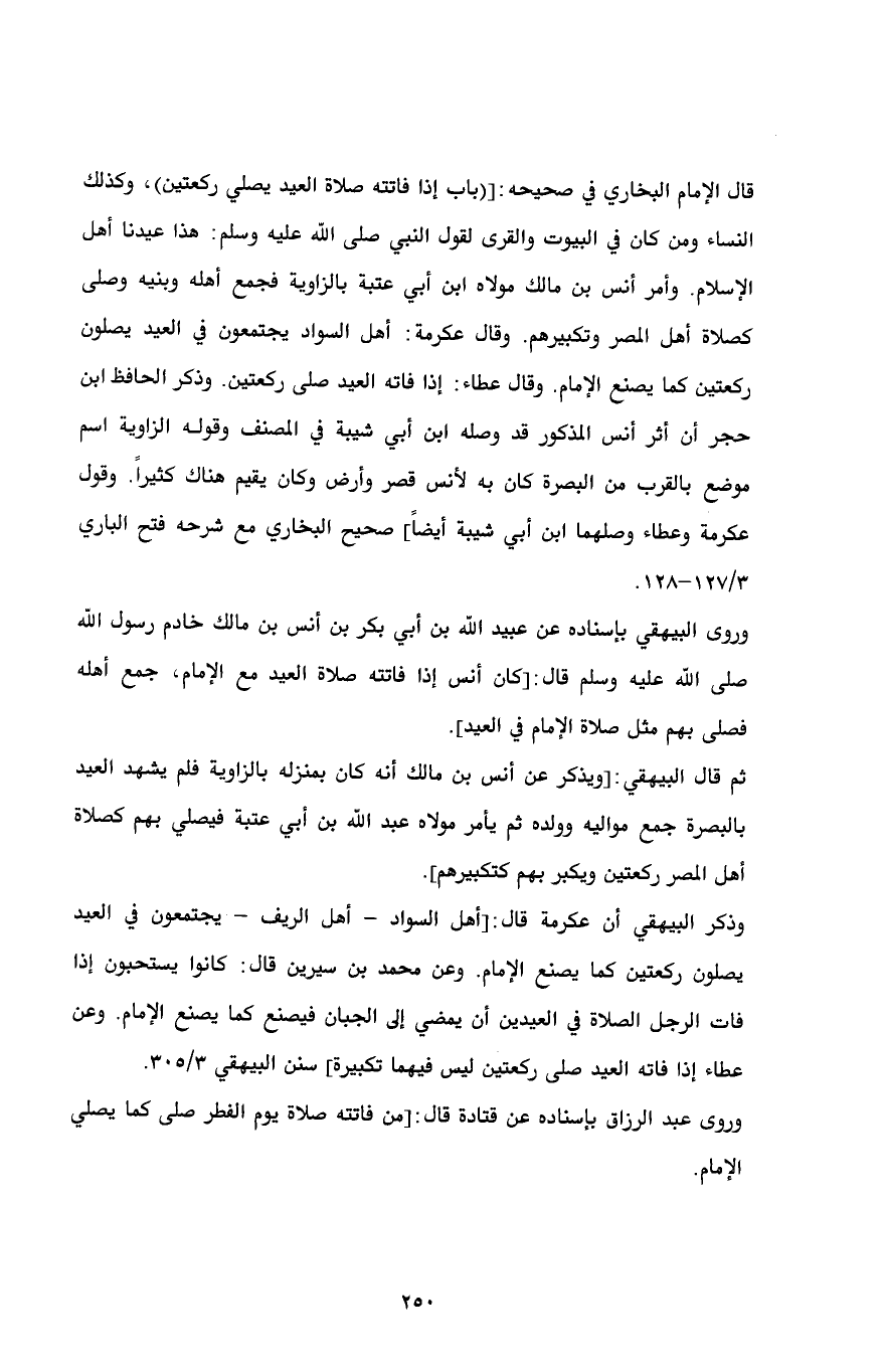 ثم قال البيهقي: [ويذكر عن أنس بن مالك أنه كان بمنزله بالزاوية فلم يشهد العيد بالبصرة جمع مواليه وولده ثم يأمر مولاه عبد الله بن أبي عتبة فيصلي بهم كصلاة أهل المصر ركعتين ويكبر بهم كتكبيرهم].
