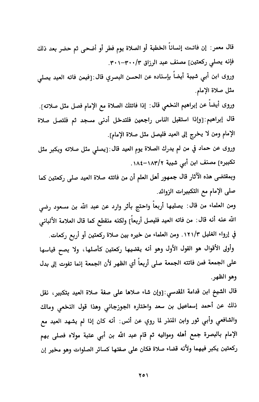 وبمقتضى هذه الآثار قال جمهور أهل العلم أن من فاتته صلاة العيد صلى ركعتين كما صلى الإمام مع التكبيرات الزوائد.