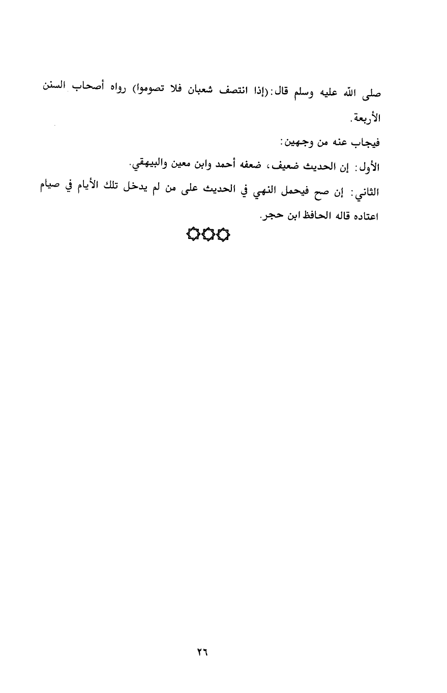 صلى الله عليه وسلم قال: (إذا انتصف شعبان فلا تصوموا) رواه أصحاب السنن الأربعة.