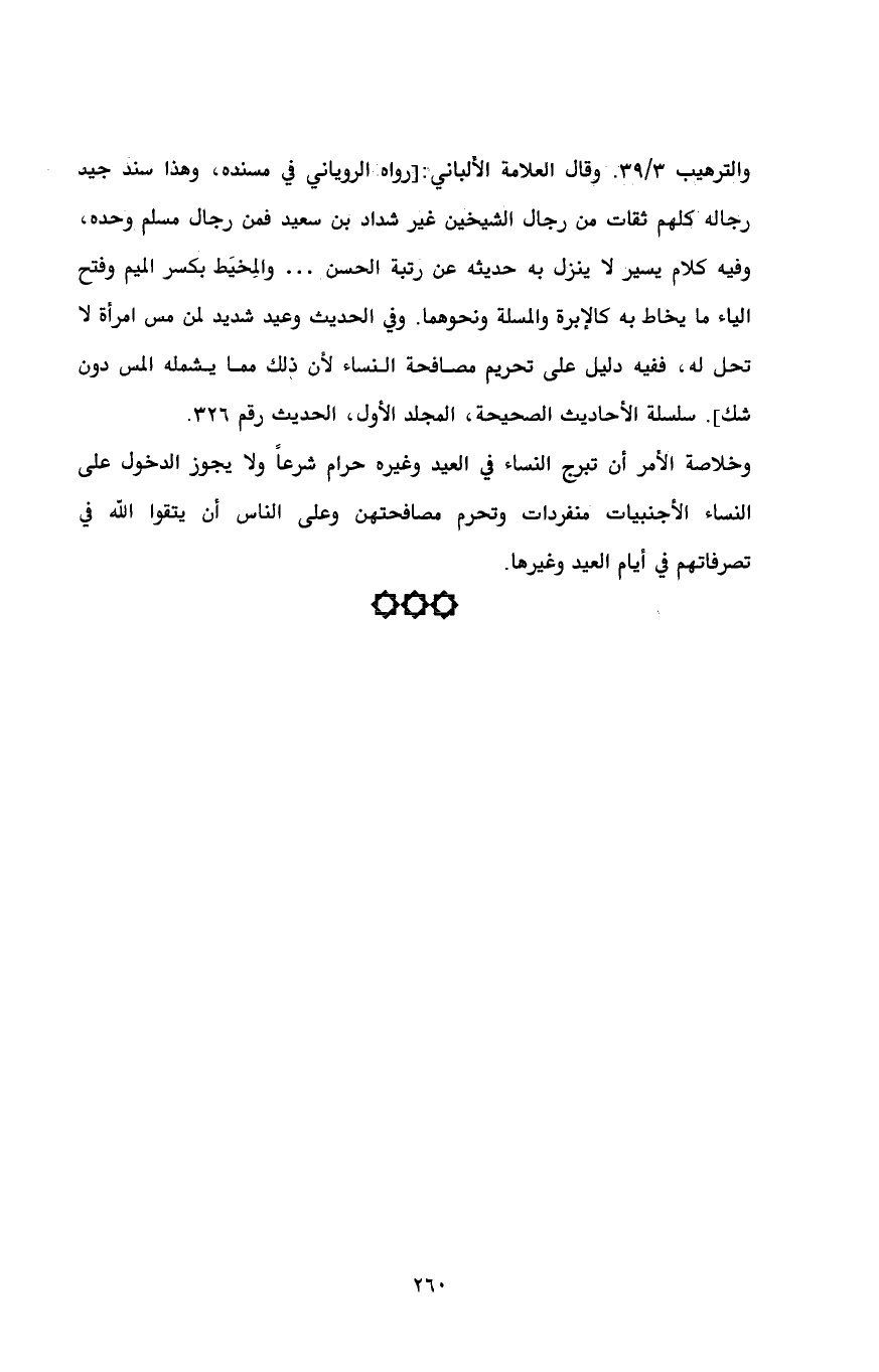 وخلاصة الأمر أن تبرج النساء في العيد وغيره حرام شرعاً ولا يجوز الدخول على النساء الأجنبيات منفردات وتحرم مصافحتهن وعلى الناس أن يتقوا الله في تصرفاتهم في أيام العيد وغيرها.