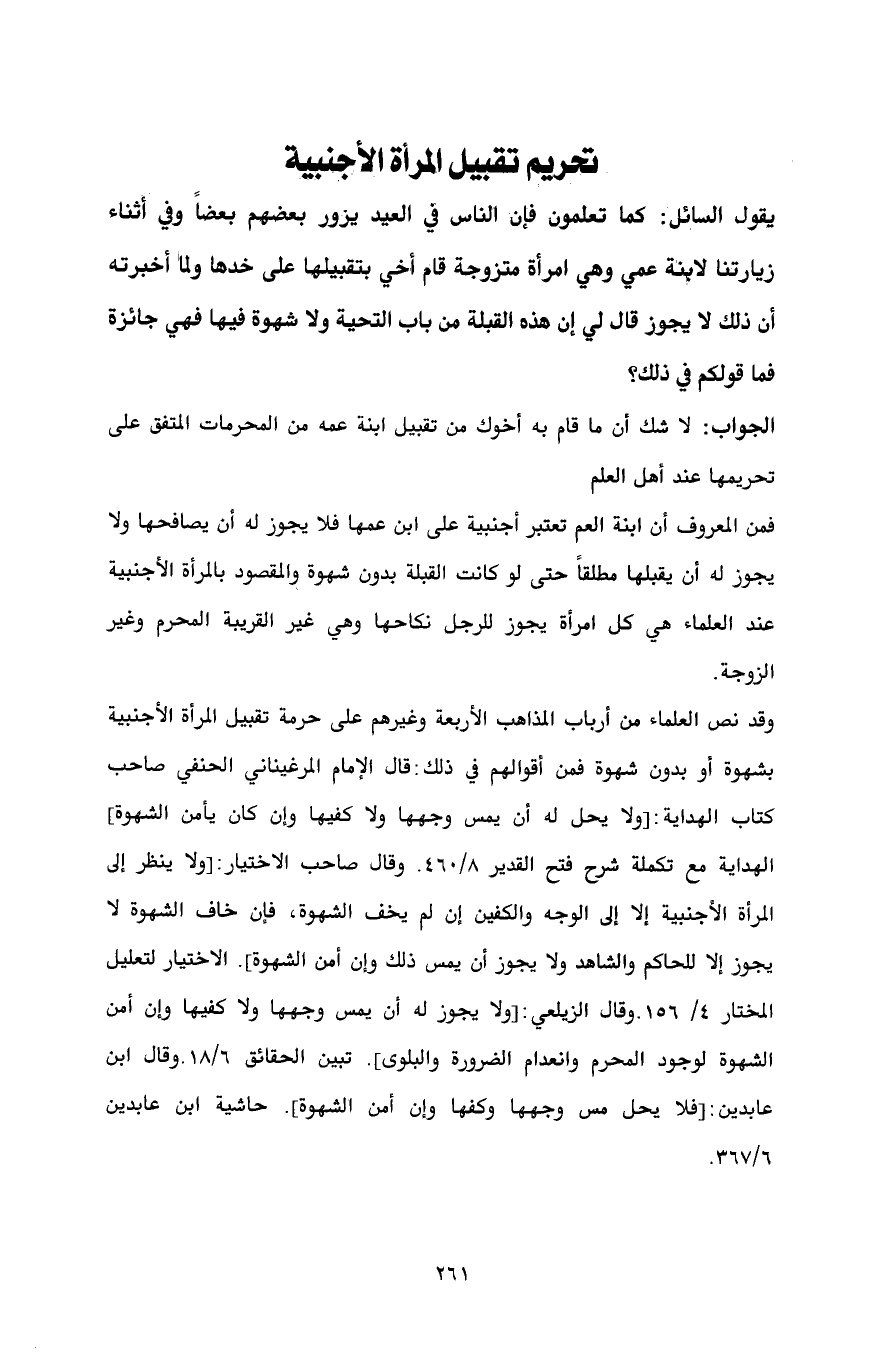يقول السائل: كما تعلمون فإن الناس في العيد يزور بعضهم بعضاً وفي أثناء زيارتنا لابنة عمي وهي امرأة متزوجة قام أخي بتقبيلها على خدها ولما أخبرته أن ذلك لا يجوز قال لي إن هذه القبلة من باب التحية ولا شهوة فيها فهي جائزة فما قولكم في ذلك؟