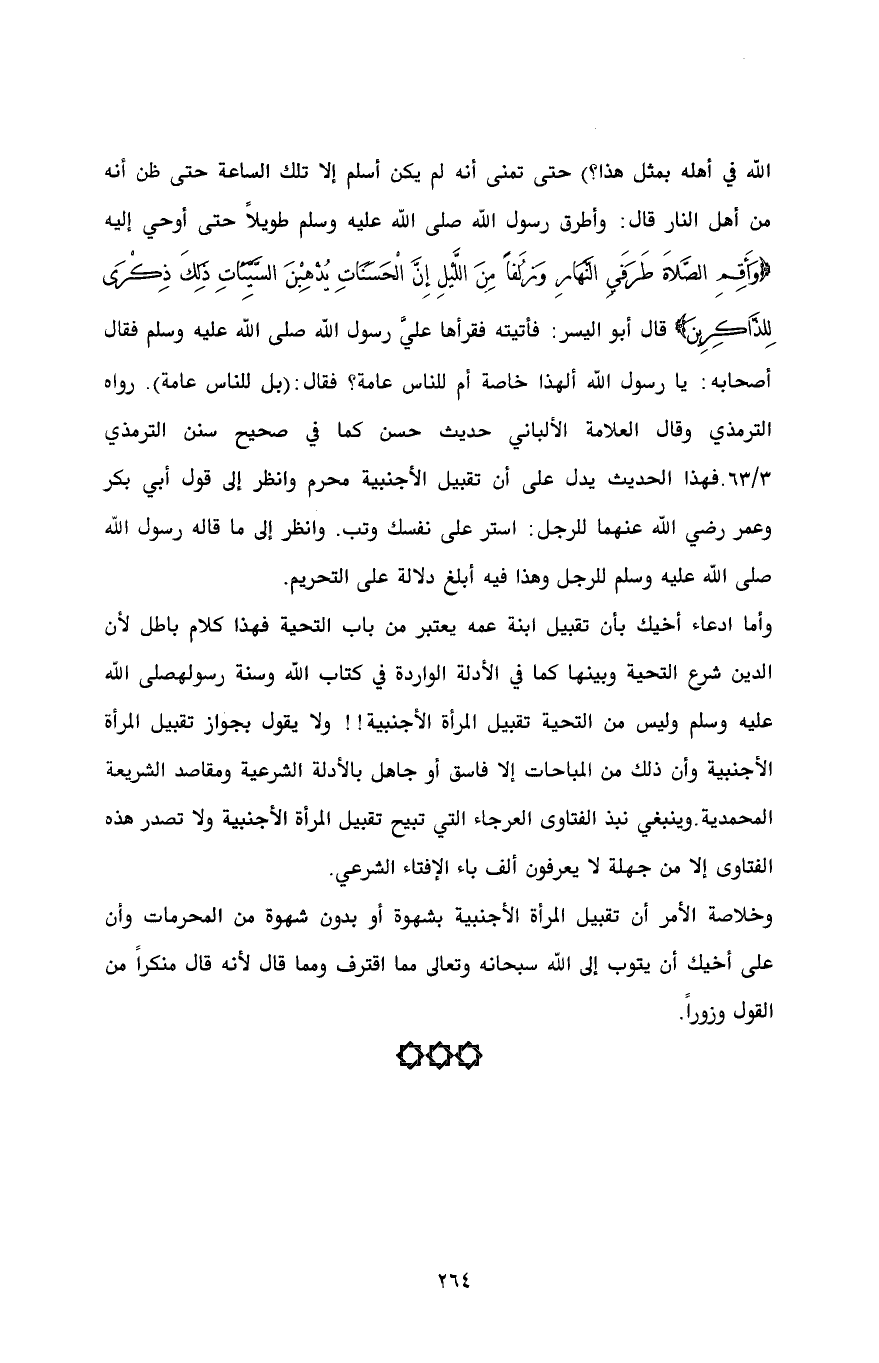الله في أهله بمثل هذا؟) حتى تمنى أنه لم يكن أسلم إلا تلك الساعة حتى ظن أنه من أهل النار قال: وأطرق رسول الله صلى الله عليه وسلم طويلاً حتى أوحي إليه {وَأَقِمِ الصَّلاةَ طَرَفَيِ النَّهَارِ وَزُلَفاً مِنَ اللَّيْلِ إِنَّ الْحَسَنَاتِ يُذْهِبْنَ السَّيِّئَاتِ ذَلِكَ ذِكْرَى لِلذَّاكِرِينَ} قال أبو اليسر: فأتيته فقرأها عليَّ رسول الله صلى الله عليه وسلم فقال أصحابه: يا رسول الله ألهذا خاصة أم للناس عامة؟ فقال: (بل للناس عامة). رواه الترمذي وقال العلامة الألباني حديث حسن كما في صحيح سنن الترمذي 3/ 63.فهذا الحديث يدل على أن تقبيل الأجنبية محرم وانظر إلى قول أبي بكر وعمر رضي الله عنهما للرجل: استر على نفسك وتب. وانظر إلى ما قاله رسول الله صلى الله عليه وسلم للرجل وهذا فيه أبلغ دلالة على التحريم.