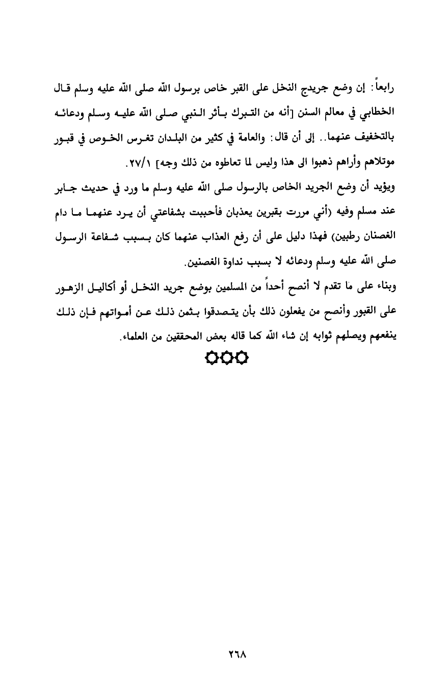 وبناء على ما تقدم لا أنصح أحداً من المسلمين بوضع جريد النخل أو أكاليل الزهور على القبور وأنصح من يفعلون ذلك بأن يتصدقوا بثمن ذلك عن أمواتهم فإن ذلك ينفعهم ويصلهم ثوابه إن شاء الله كما قاله بعض المحققين من العلماء.