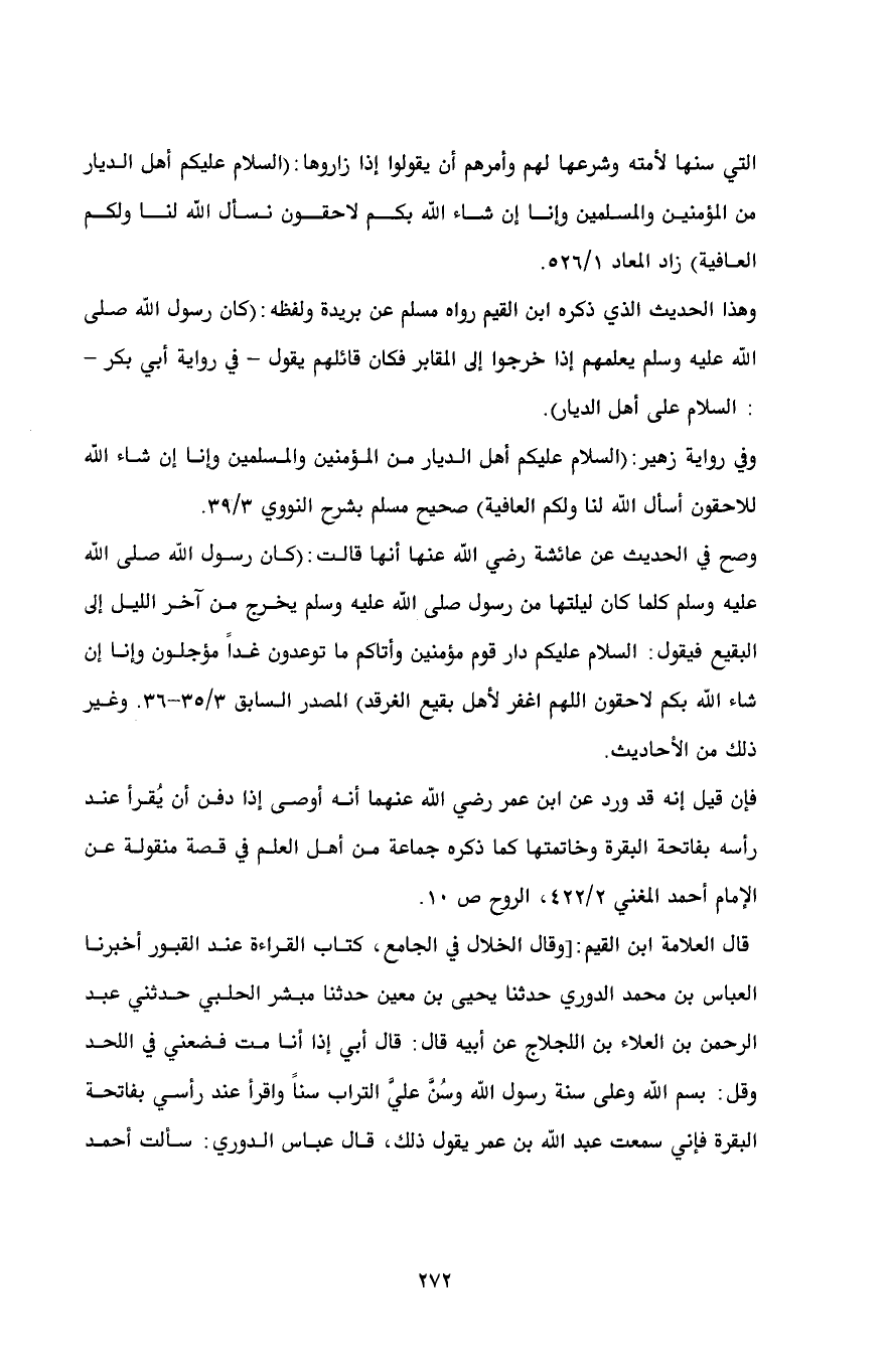 قال العلامة ابن القيم: [وقال الخلال في الجامع، كتاب القراءة عند القبور أخبرنا العباس بن محمد الدوري حدثنا يحيى بن معين حدثنا مبشر الحلبي حدثني عبد الرحمن بن العلاء بن اللجلاج عن أبيه قال: قال أبي إذا أنا مت فضعني في اللحد وقل: بسم الله وعلى سنة رسول الله وسُنَّ عليَّ التراب سناً واقرأ عند رأسي بفاتحة البقرة فإني سمعت عبد الله بن عمر يقول ذلك، قال عباس الدوري: سألت أحمد