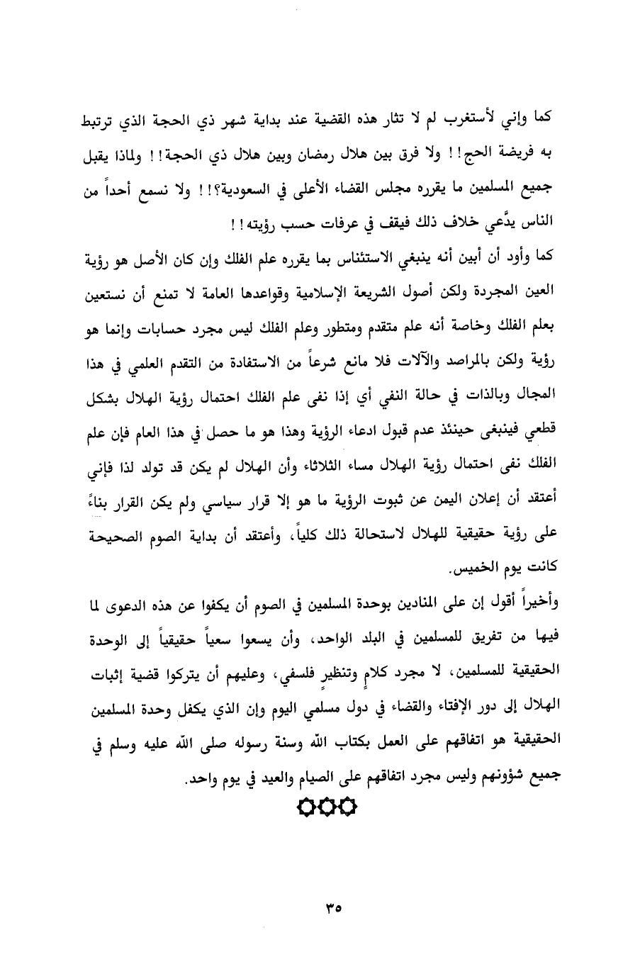 كما وإني لأستغرب لم لا تثار هذه القضية عند بداية شهر ذي الحجة الذي ترتبط به فريضة الحج!! ولا فرق بين هلال رمضان وبين هلال ذي الحجة!! ولماذا يقبل جميع المسلمين ما يقرره مجلس القضاء الأعلى في السعودية؟!! ولا نسمع أحداً من الناس يدَّعي خلاف ذلك فيقف في عرفات حسب رؤيته!!