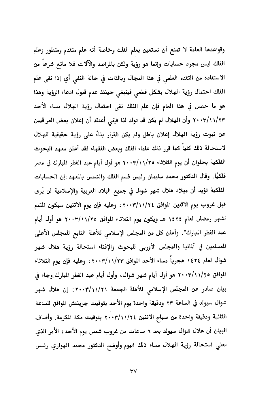 وقواعدها العامة لا تمنع أن نستعين بعلم الفلك وخاصة أنه علم متقدم ومتطور وعلم الفلك ليس مجرد حسابات وإنما هو رؤية ولكن بالمراصد والآلات فلا مانع شرعاً من الاستفادة من التقدم العلمي في هذا المجال وبالذات في حالة النفي أي إذا نفى علم الفلك احتمال رؤية الهلال بشكل قطعي فينبغي حينئذ عدم قبول ادعاء الرؤية وهذا هو ما حصل في هذا العام فإن علم الفلك نفى احتمال رؤية الهلال مساء الأحد 23/ 11/2003 وأن الهلال لم يكن قد تولد لذا فإني أعتقد أن إعلان بعض العراقيين عن ثبوت رؤية الهلال إعلان باطل ولم يكن القرار بناءً على رؤية حقيقية للهلال لاستحالة ذلك كلياً كما قرر ذلك علماء الفلك وبعض الفقهاء فقد أعلن معهد البحوث الفلكية بحلوان أن يوم الثلاثاء 25/ 11/2003 هو أول أيام عيد الفطر المبارك في مصر فلكيًا. وقال الدكتور محمد سليمان رئيس قسم الفلك والشمس بالمعهد: إن الحسابات الفلكية تؤيد أن ميلاد هلال شهر شوال في جميع البلاد العربية والإسلامية لن يُرى قبل غروب يوم الاثنين الموافق 24/ 11/2003، وعليه فإن يوم الاثنين سيكون المتمم لشهر رمضان لعام 1424 هـ ويكون يوم الثلاثاء الموافق 25/ 11/2003 هو أول أيام عيد الفطر المبارك". وأعلن كل من المجلس الإسلامي للأهلة التابع للمجلس الأعلى للمسلمين في ألمانيا والمجلس الأوربي للبحوث والإفتاء استحالة رؤية هلال شهر شوال لعام 1424 هجرياً مساء الأحد الموافق 23/ 11/2003، وعليه فإن يوم الثلاثاء الموافق 25/ 11/2003 هو أول أيام شهر شوال، وأول أيام عيد الفطر المبارك. وجاء في بيان صادر عن المجلس الإسلامي للأهلة الجمعة 21/ 11/2003: إن هلال شهر شوال سيولد في الساعة 23 ودقيقة واحدة يوم الأحد بتوقيت جرينتش الموافق للساعة الثانية ودقيقة واحدة من صباح الاثنين 24/ 11/2003 بتوقيت مكة المكرمة. وأضاف البيان أن هلال شوال سيولد بعد 6 ساعات من غروب شمس يوم الأحد؛ الأمر الذي يعني استحالة رؤية الهلال مساء ذلك اليوم. وأوضح الدكتور محمد الهواري رئيس