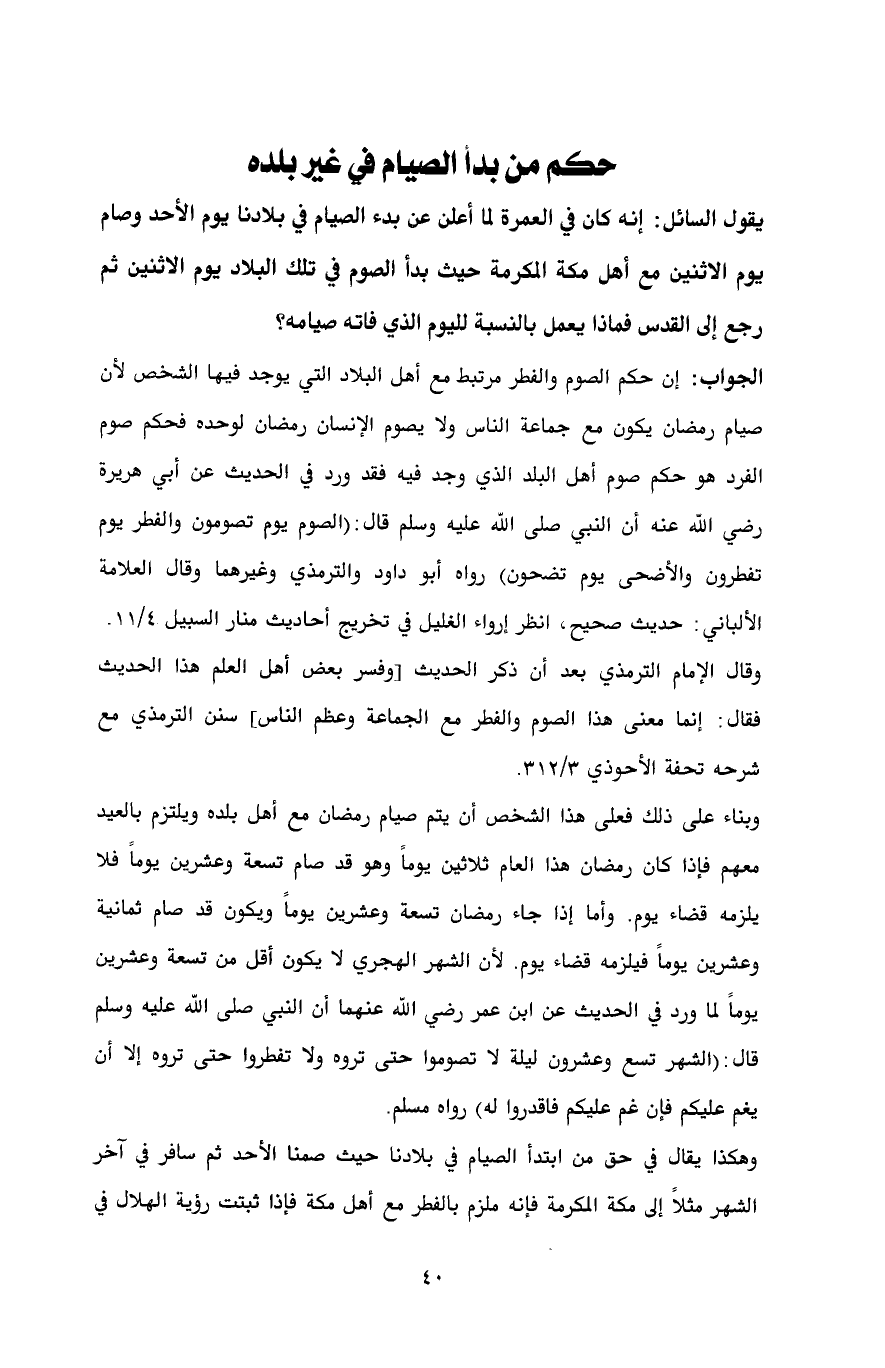 وهكذا يقال في حق من ابتدأ الصيام في بلادنا حيث صمنا الأحد ثم سافر في آخر الشهر مثلاً إلى مكة المكرمة فإنه ملزم بالفطر مع أهل مكة فإذا ثبتت رؤية الهلال في