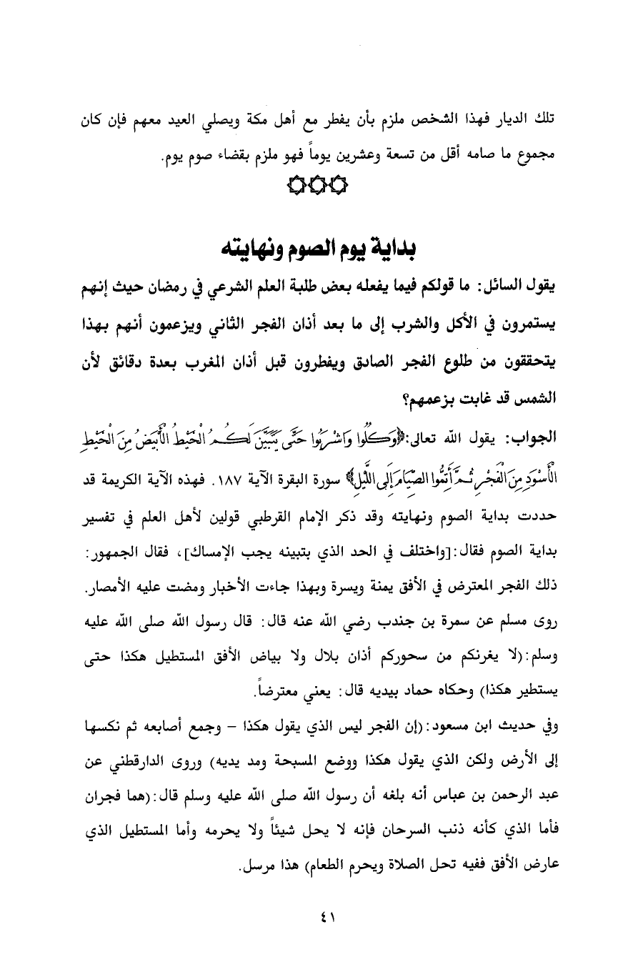 الجواب: يقول الله تعالى: {وَكُلُوا وَاشْرَبُوا حَتَّى يَتَبَيَّنَ لَكُمُ الْخَيْطُ الْأَبْيَضُ مِنَ الْخَيْطِ الْأَسْوَدِ مِنَ الْفَجْرِ ثُمَّ أَتِمُّوا الصِّيَامَ إِلَى اللَّيْلِ} سورة البقرة الآية 187. فهذه الآية الكريمة قد حددت بداية الصوم ونهايته وقد ذكر الإمام القرطبي قولين لأهل العلم في تفسير بداية الصوم فقال: [واختلف في الحد الذي بتبينه يجب الإمساك]، فقال الجمهور: ذلك الفجر المعترض في الأفق يمنة ويسرة وبهذا جاءت الأخبار ومضت عليه الأمصار. روى مسلم عن سمرة بن جندب رضي الله عنه قال: قال رسول الله صلى الله عليه وسلم: (لا يغرنكم من سحوركم أذان بلال ولا بياض الأفق المستطيل هكذا حتى يستطير هكذا) وحكاه حماد بيديه قال: يعني معترضاً.