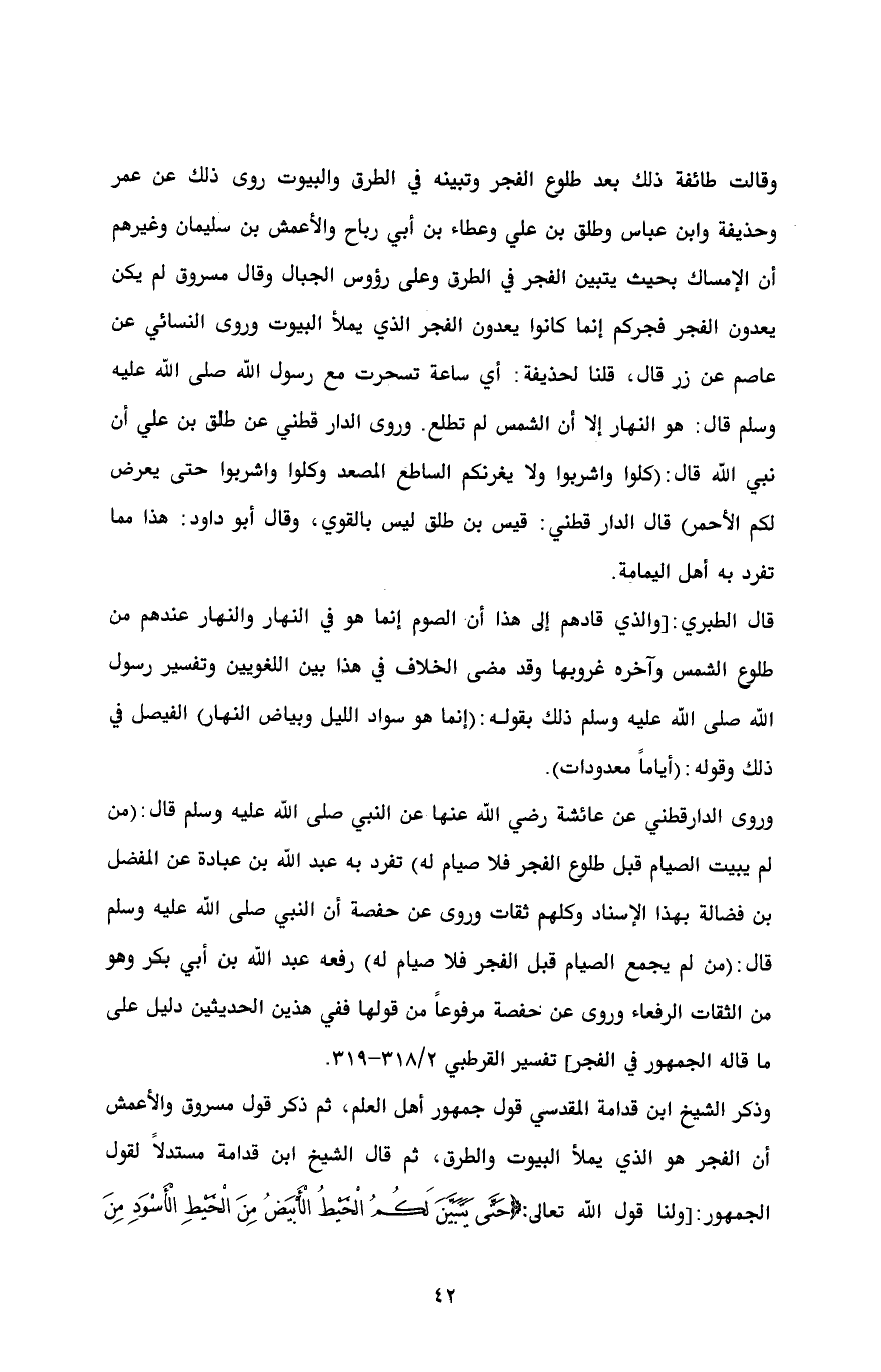 وذكر الشيخ ابن قدامة المقدسي قول جمهور أهل العلم، ثم ذكر قول مسروق والأعمش أن الفجر هو الذي يملأ البيوت والطرق، ثم قال الشيخ ابن قدامة مستدلاً لقول الجمهور: [ولنا قول الله تعالى: {حَتَّى يَتَبَيَّنَ لَكُمُ الْخَيْطُ الْأَبْيَضُ مِنَ الْخَيْطِ الْأَسْوَدِ مِنَ