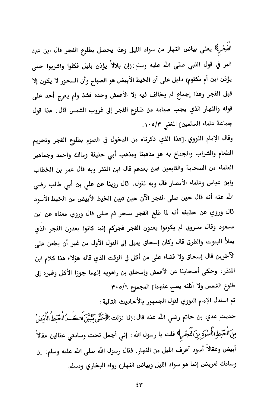 الْفَجْرِ} يعني بياض النهار من سواد الليل وهذا يحصل بطلوع الفجر قال ابن عبد البر في قول النبي صلى الله عليه وسلم: (إن بلالاً يؤذن بليل فكلوا واشربوا حتى يؤذن ابن أم مكتوم) دليل على أن الخيط الأبيض هو الصباح وأن السحور لا يكون إلا قبل الفجر وهذا إجماع لم يخالف فيه إلا الأعمش وحده فشذ ولم يعرج أحد على قوله والنهار الذي يجب صيامه من طلوع الفجر إلى غروب الشمس قال: هذا قول جماعة علماء المسلمين] المغني 3/ 105.