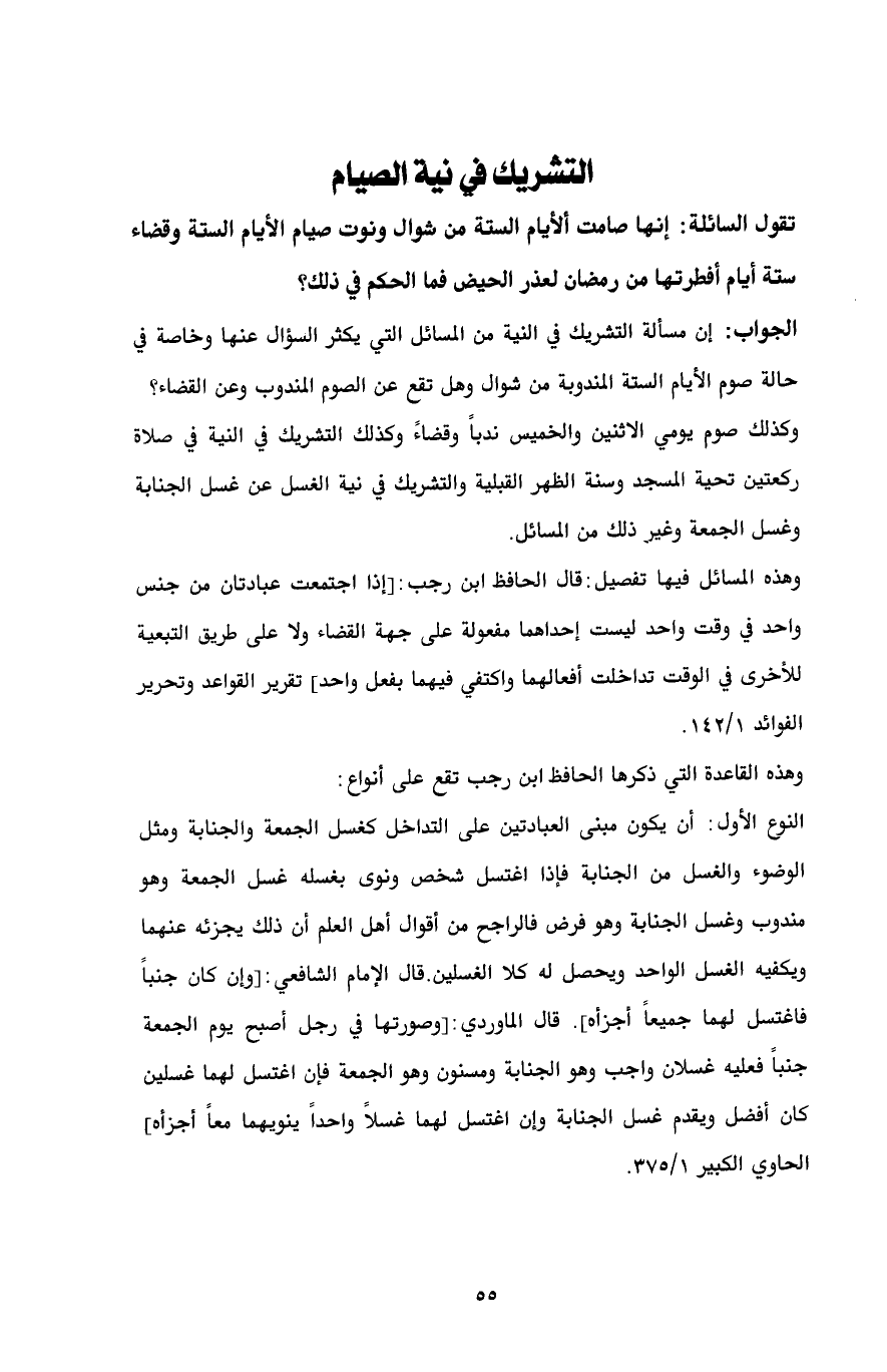 وكذلك صوم يومي الاثنين والخميس ندباً وقضاءً وكذلك التشريك في النية في صلاة ركعتين تحية المسجد وسنة الظهر القبلية والتشريك في نية الغسل عن غسل الجنابة وغسل الجمعة وغير ذلك من المسائل.