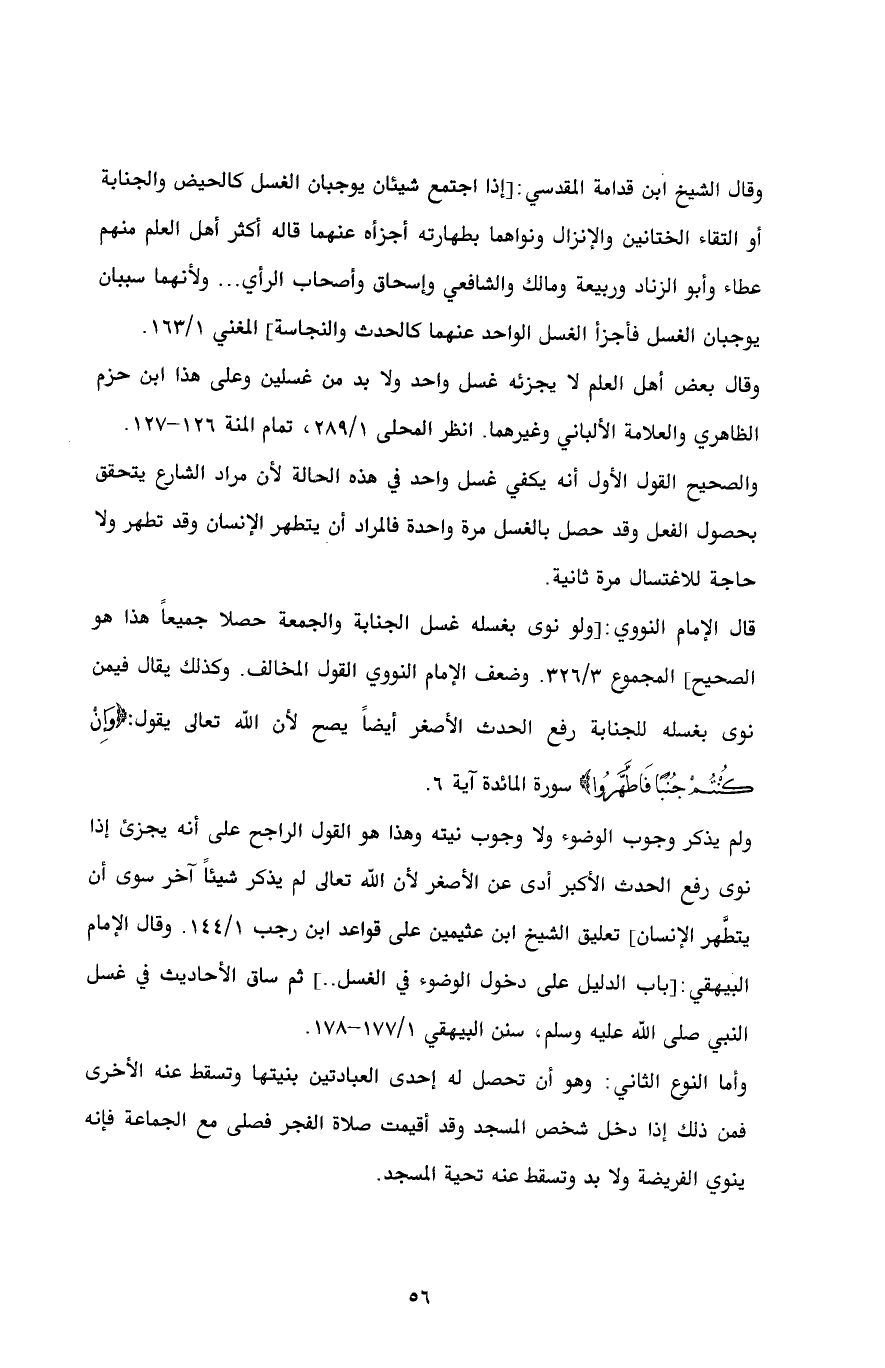 وقال الشيخ ابن قدامة المقدسي: [إذا اجتمع شيئان يوجبان الغسل كالحيض والجنابة أو التقاء الختانين والإنزال ونواهما بطهارته أجزأه عنهما قاله أكثر أهل العلم منهم عطاء وأبو الزناد وربيعة ومالك والشافعي وإسحاق وأصحاب الرأي ... ولأنهما سببان يوجبان الغسل فأجزأ الغسل الواحد عنهما كالحدث والنجاسة] المغني 1/ 163.
