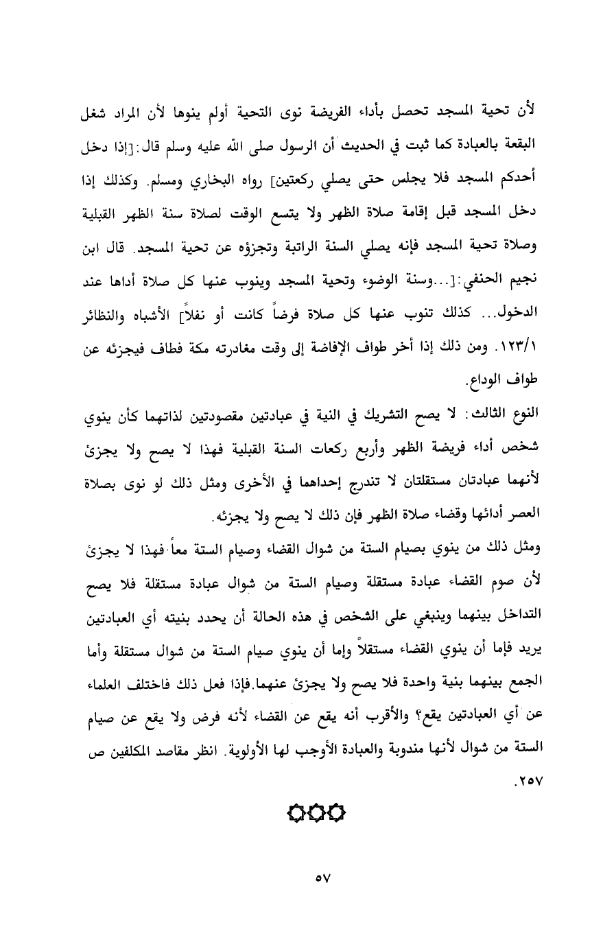 ومثل ذلك من ينوي بصيام الستة من شوال القضاء وصيام الستة معاً فهذا لا يجزئ لأن صوم القضاء عبادة مستقلة وصيام الستة من شوال عبادة مستقلة فلا يصح التداخل بينهما وينبغي على الشخص في هذه الحالة أن يحدد بنيته أي العبادتين يريد فإما أن ينوي القضاء مستقلاً وإما أن ينوي صيام الستة من شوال مستقلة وأما الجمع بينهما بنية واحدة فلا يصح ولا يجزئ عنهما. فإذا فعل ذلك فاختلف العلماء عن أي العبادتين يقع؟ والأقرب أنه يقع عن القضاء لأنه فرض ولا يقع عن صيام الستة من شوال لأنها مندوبة والعبادة الأوجب لها الأولوية. انظر مقاصد المكلفين ص 257.