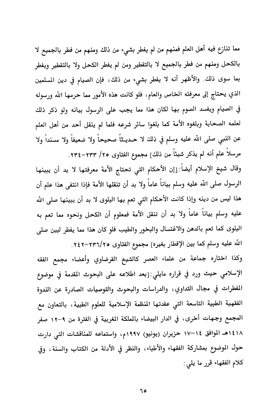 وقال شيخ الإسلام أيضاً: [إن الأحكام التي تحتاج الأمة معرفتها لا بد أن يبينها الرسول صلى الله عليه وسلم بياناً عاماً ولا بد أن تنقلها الأمة فإذا انتفى هذا علم أن هذا ليس من دينه وإذا كانت الأحكام التي تعم بها البلوى لا بد أن يبينها صلى الله عليه وسلم بياناً عاماً ولا بد أن تنقل الأمة فمعلوم أن الكحل ونحوه مما تعم به البلوى كما تعم بالدهن والاغتسال والبخور والطيب فلو كان هذا مما يفطر لبين صلى الله عليه وسلم كما بين الإفطار بغيره] مجموع الفتاوى 25/ 236 - 242.