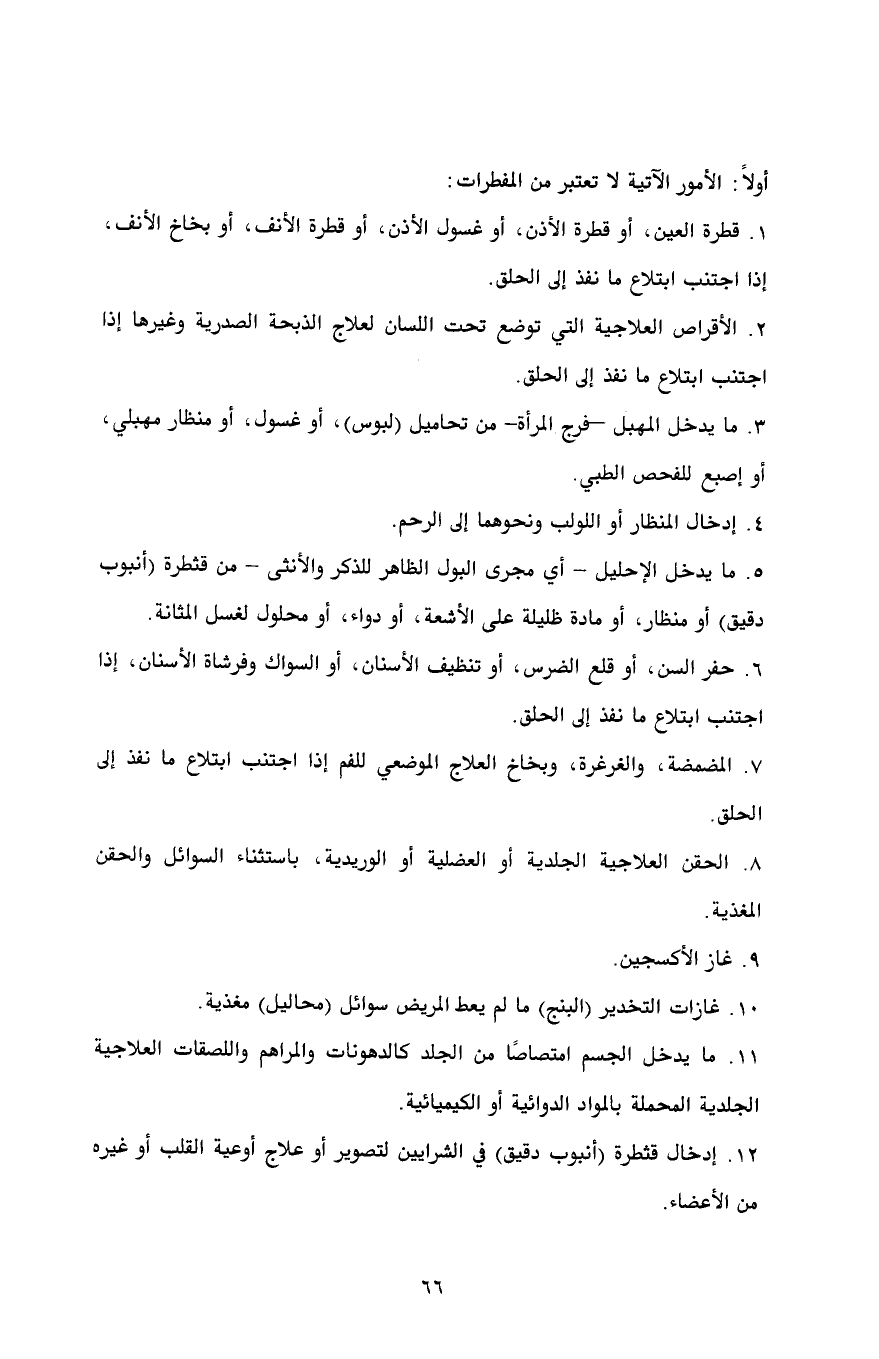 1. قطرة العين، أو قطرة الأذن، أو غسول الأذن، أو قطرة الأنف، أو بخاخ الأنف، إذا اجتنب ابتلاع ما نفذ إلى الحلق.