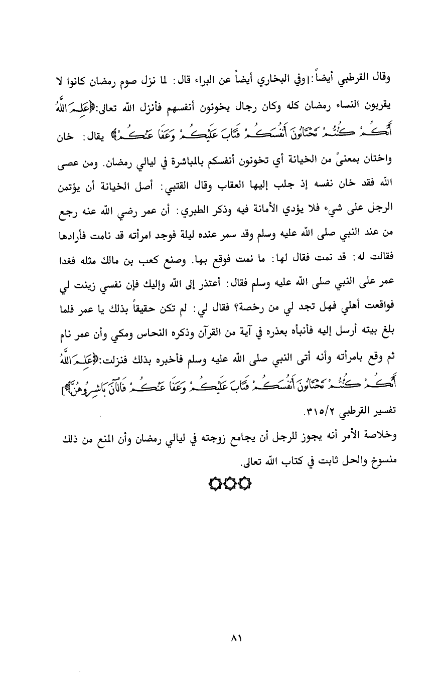 وقال القرطبي أيضاً: [وفي البخاري أيضاً عن البراء قال: لما نزل صوم رمضان كانوا لا يقربون النساء رمضان كله وكان رجال يخونون أنفسهم فأنزل الله تعالى: {عَلِمَ اللَّهُ أَنَّكُمْ كُنْتُمْ تَخْتَانُونَ أَنْفُسَكُمْ فَتَابَ عَلَيْكُمْ وَعَفَا عَنْكُمْ} يقال: خان واختان بمعنىً من الخيانة أي تخونون أنفسكم بالمباشرة في ليالي رمضان. ومن عصى الله فقد خان نفسه إذ جلب إليها العقاب وقال القتبي: أصل الخيانة أن يؤتمن الرجل على شيء فلا يؤدي الأمانة فيه وذكر الطبري: أن عمر رضي الله عنه رجع من عند النبي صلى الله عليه وسلم وقد سمر عنده ليلة فوجد امرأته قد نامت فأرادها فقالت له: قد نمت فقال لها: ما نمت فوقع بها. وصنع كعب بن مالك مثله فغدا عمر على النبي صلى الله عليه وسلم فقال: أعتذر إلى الله وإليك فإن نفسي زينت لي فواقعت أهلي فهل تجد لي من رخصة؟ فقال لي: لم تكن حقيقاً بذلك يا عمر فلما بلغ بيته أرسل إليه فأنبأه بعذره في آية من القرآن وذكره النحاس ومكي وأن عمر نام ثم وقع بامرأته وأنه أتى النبي صلى الله عليه وسلم فأخبره بذلك فنزلت: {عَلِمَ اللَّهُ أَنَّكُمْ كُنْتُمْ تَخْتَانُونَ أَنْفُسَكُمْ فَتَابَ عَلَيْكُمْ وَعَفَا عَنْكُمْ فَالْآنَ بَاشِرُوهُنَّ}] تفسير القرطبي 2/ 315.