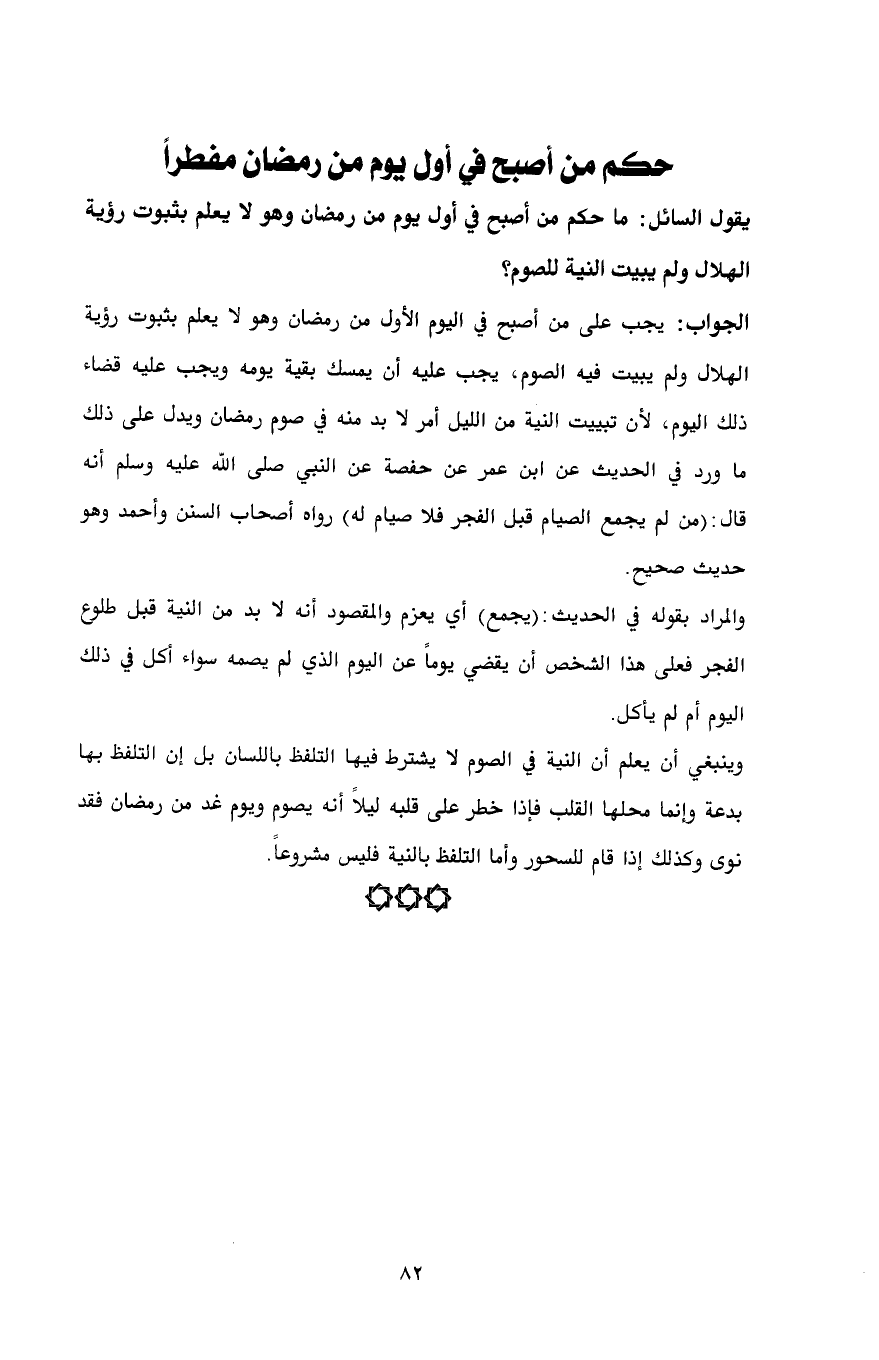 يقول السائل: ما حكم من أصبح في أول يوم من رمضان وهو لا يعلم بثبوت رؤية الهلال ولم يبيت النية للصوم؟