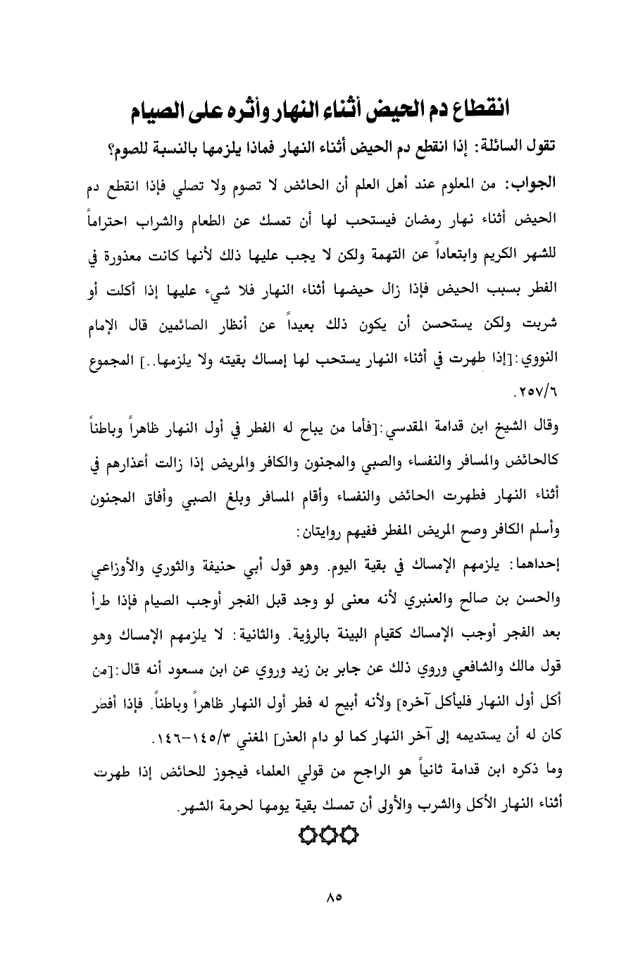 وما ذكره ابن قدامة ثانياً هو الراجح من قولي العلماء فيجوز للحائض إذا طهرت أثناء النهار الأكل والشرب والأولى أن تمسك بقية يومها لحرمة الشهر.