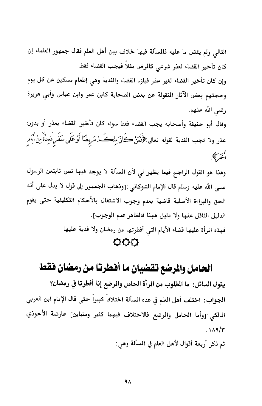 الجواب: اختلف أهل العلم في هذه المسألة اختلافاً كبيراً حتى قال الإمام ابن العربي المالكي: [وأما الحامل والمرضع فالاختلاف فيهما كثير ومتباين] عارضة الأحوذي 3/ 189.