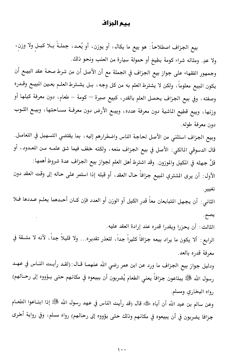 الرابع: ألا يكون ما يراد بيعه جزافاً كثيراً جداً، لتعذر تقديره ... ولا قليلاً جداً، لأنه لا مشقة في معرفة قدره بالعد.
