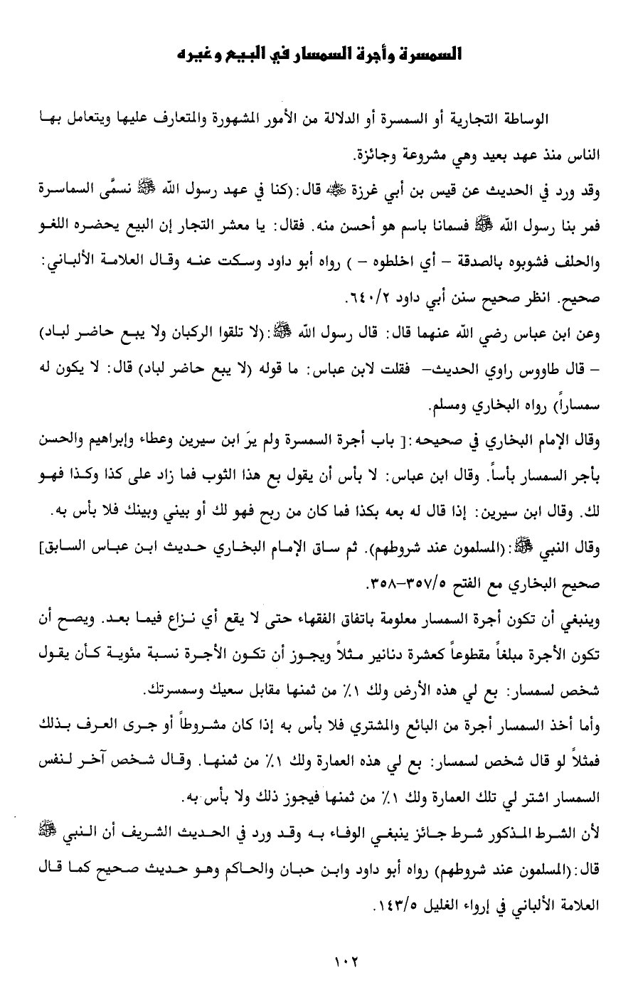 وقال الإمام البخاري في صحيحه: [باب أجرة السمسرة ولم يرَ ابن سيرين وعطاء وإبراهيم والحسن بأجر السمسار بأساً. وقال ابن عباس: لا بأس أن يقول بع هذا الثوب فما زاد على كذا وكذا فهو لك. وقال ابن سيرين: إذا قال له بعه بكذا فما كان من ربح فهو لك أو بيني وبينك فلا بأس به.