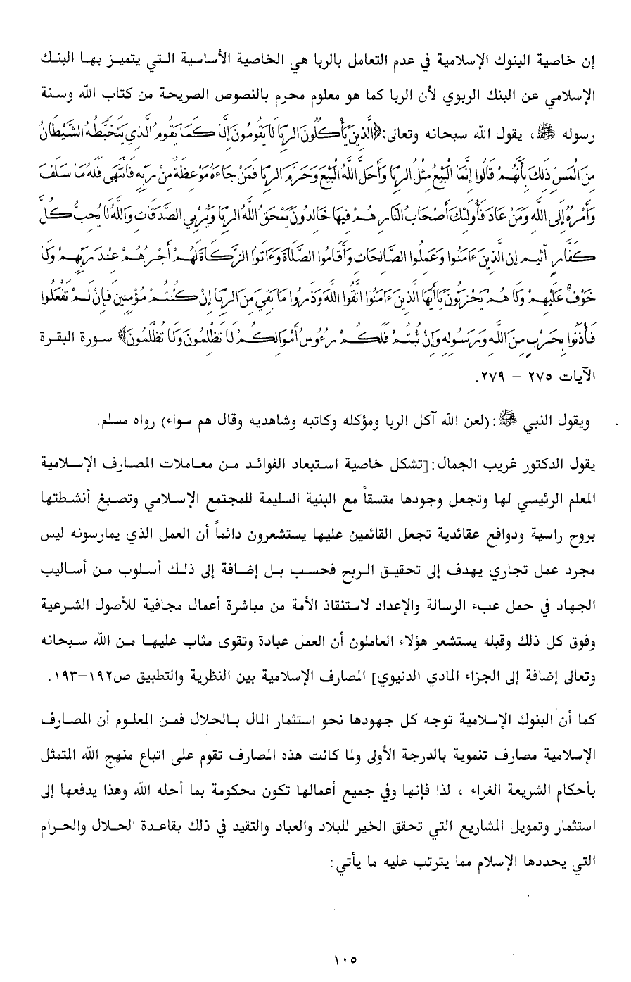 يقول الدكتور غريب الجمال: [تشكل خاصية استبعاد الفوائد من معاملات المصارف الإسلامية المعلم الرئيسي لها وتجعل وجودها متسقاً مع البنية السليمة للمجتمع الإسلامي وتصبغ أنشطتها بروح راسية ودوافع عقائدية تجعل القائمين عليها يستشعرون دائماً أن العمل الذي يمارسونه ليس مجرد عمل تجاري يهدف إلى تحقيق الربح فحسب بل إضافة إلى ذلك أسلوب من أساليب الجهاد في حمل عبء الرسالة والإعداد لاستنقاذ الأمة من مباشرة أعمال مجافية للأصول الشرعية وفوق كل ذلك وقبله يستشعر هؤلاء العاملون أن العمل عبادة وتقوى مثاب عليها من الله سبحانه وتعالى إضافة إلى الجزاء المادي الدنيوي] المصارف الإسلامية بين النظرية والتطبيق ص192 - 193.