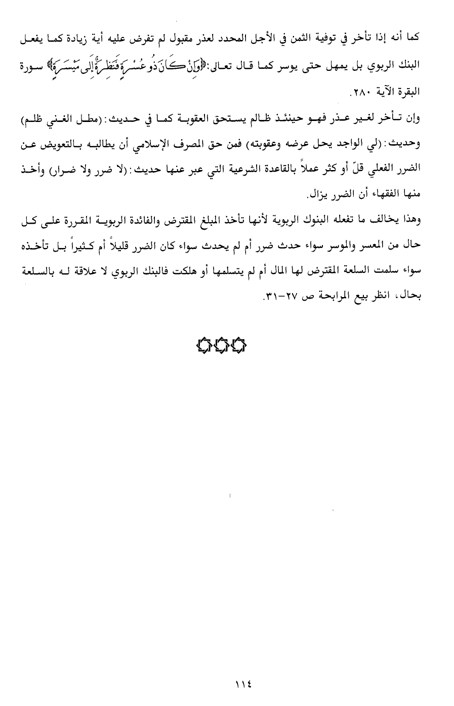 كما أنه إذا تأخر في توفية الثمن في الأجل المحدد لعذر مقبول لم تفرض عليه أية زيادة كما يفعل البنك الربوي بل يمهل حتى يوسر كما قال تعالى: {وَإِنْ كَانَ ذُو عُسْرَةٍ فَنَظِرَةٌ إِلَى مَيْسَرَةٍ} سورة البقرة الآية 280.
