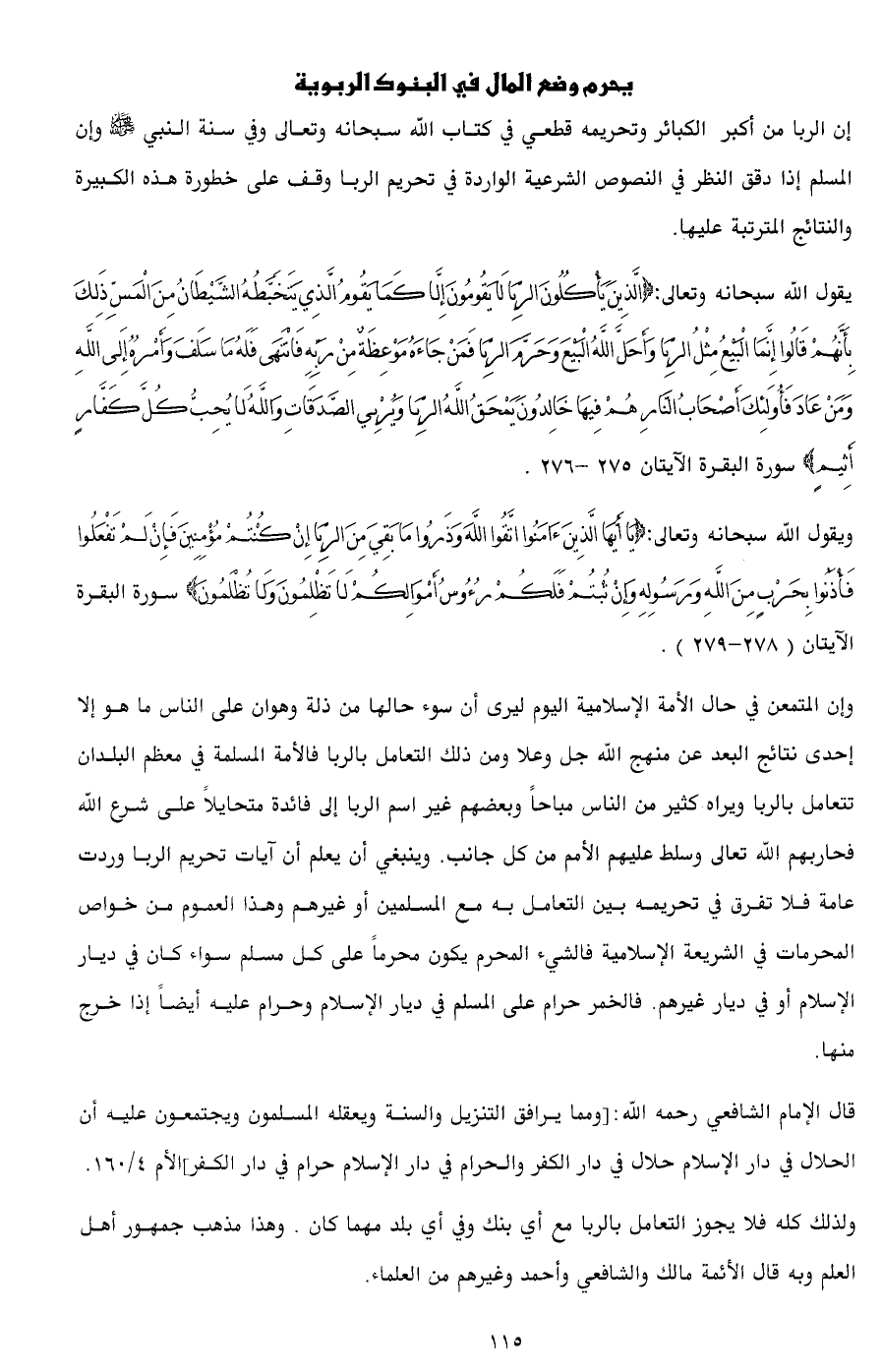 وإن المتمعن في حال الأمة الإسلامية اليوم ليرى أن سوء حالها من ذلة وهوان على الناس ما هو إلا إحدى نتائج البعد عن منهج الله جل وعلا ومن ذلك التعامل بالربا فالأمة المسلمة في معظم البلدان تتعامل بالربا ويراه كثير من الناس مباحاً وبعضهم غير اسم الربا إلى فائدة متحايلاً على شرع الله فحاربهم الله تعالى وسلط عليهم الأمم من كل جانب. وينبغي أن يعلم أن آيات تحريم الربا وردت عامة فلا تفرق في تحريمه بين التعامل به مع المسلمين أو غيرهم وهذا العموم من خواص المحرمات في الشريعة الإسلامية فالشيء المحرم يكون محرماً على كل مسلم سواء كان في ديار الإسلام أو في ديار غيرهم. فالخمر حرام على المسلم في ديار الإسلام وحرام عليه أيضاً إذا خرج منها.