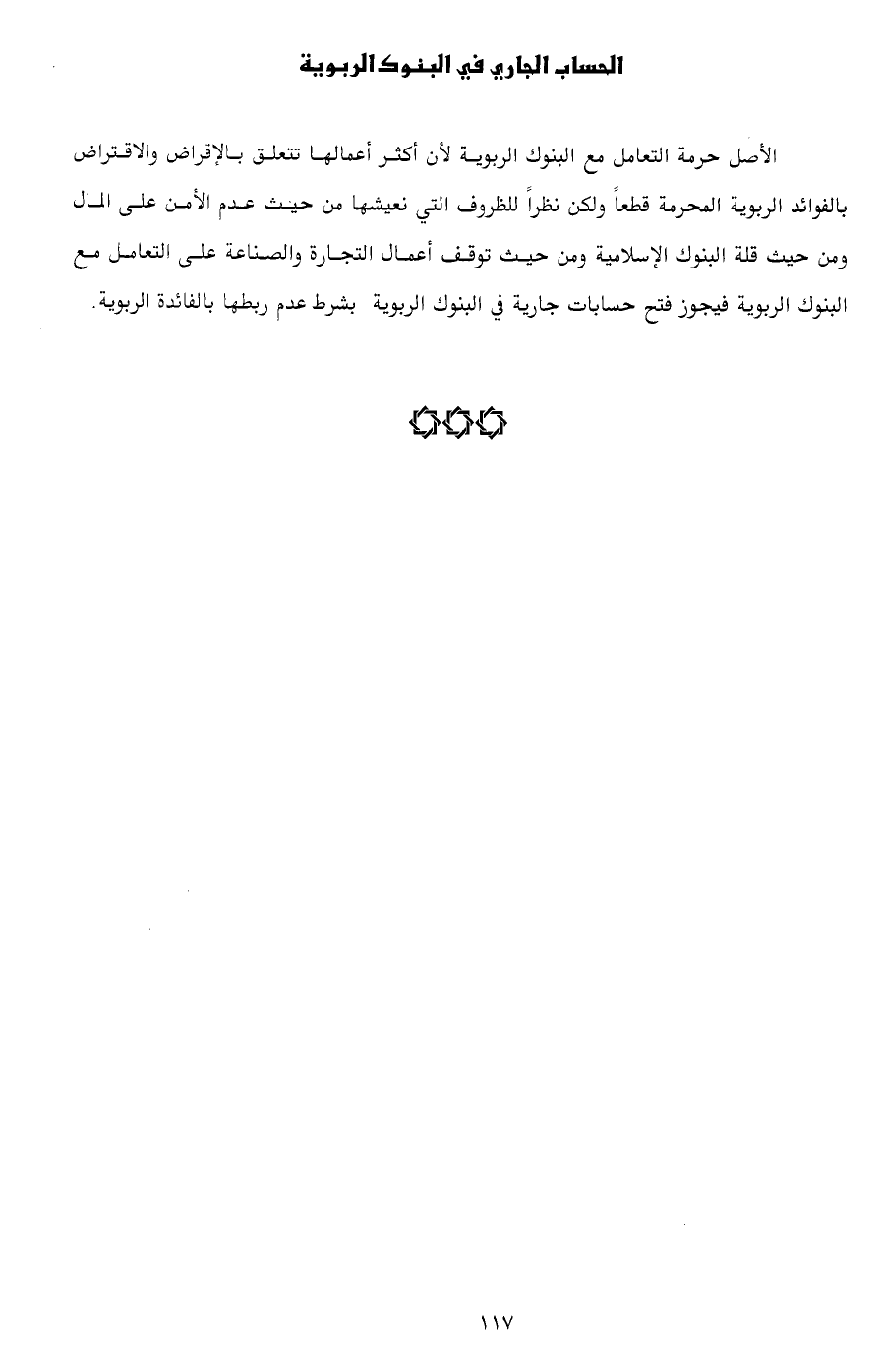 الأصل حرمة التعامل مع البنوك الربوية لأن أكثر أعمالها تتعلق بالإقراض والاقتراض بالفوائد الربوية المحرمة قطعاً ولكن نظراً للظروف التي نعيشها من حيث عدم الأمن على المال ومن حيث قلة البنوك الإسلامية ومن حيث توقف أعمال التجارة والصناعة على التعامل مع البنوك الربوية فيجوز فتح حسابات جارية في البنوك الربوية بشرط عدم ربطها بالفائدة الربوية.