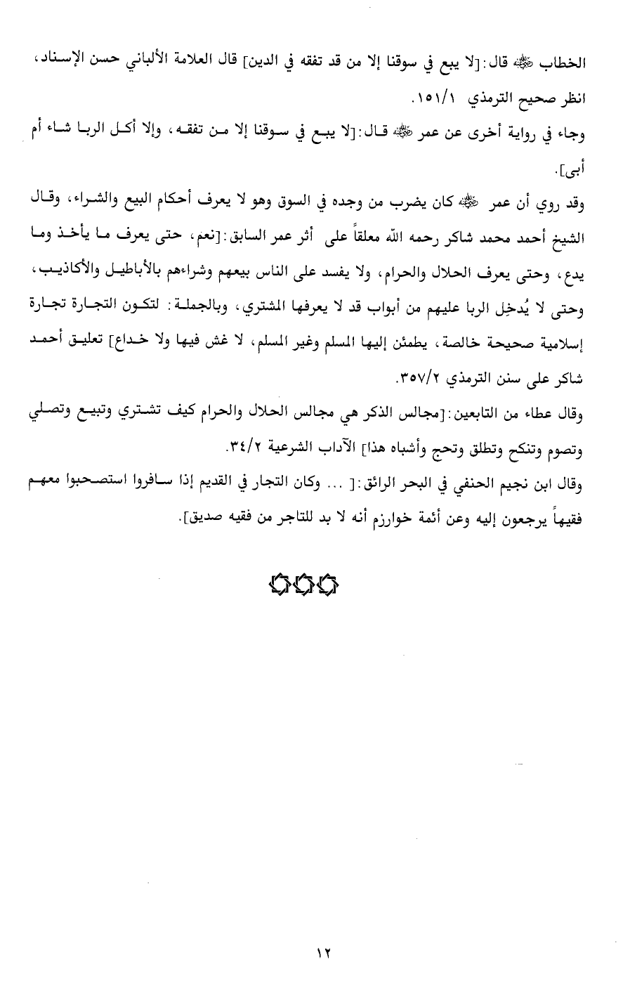 الخطاب - رضي الله عنه - قال: [لا يبع في سوقنا إلا من قد تفقه في الدين] قال العلامة الألباني حسن الإسناد، انظر صحيح الترمذي 1/ 151.